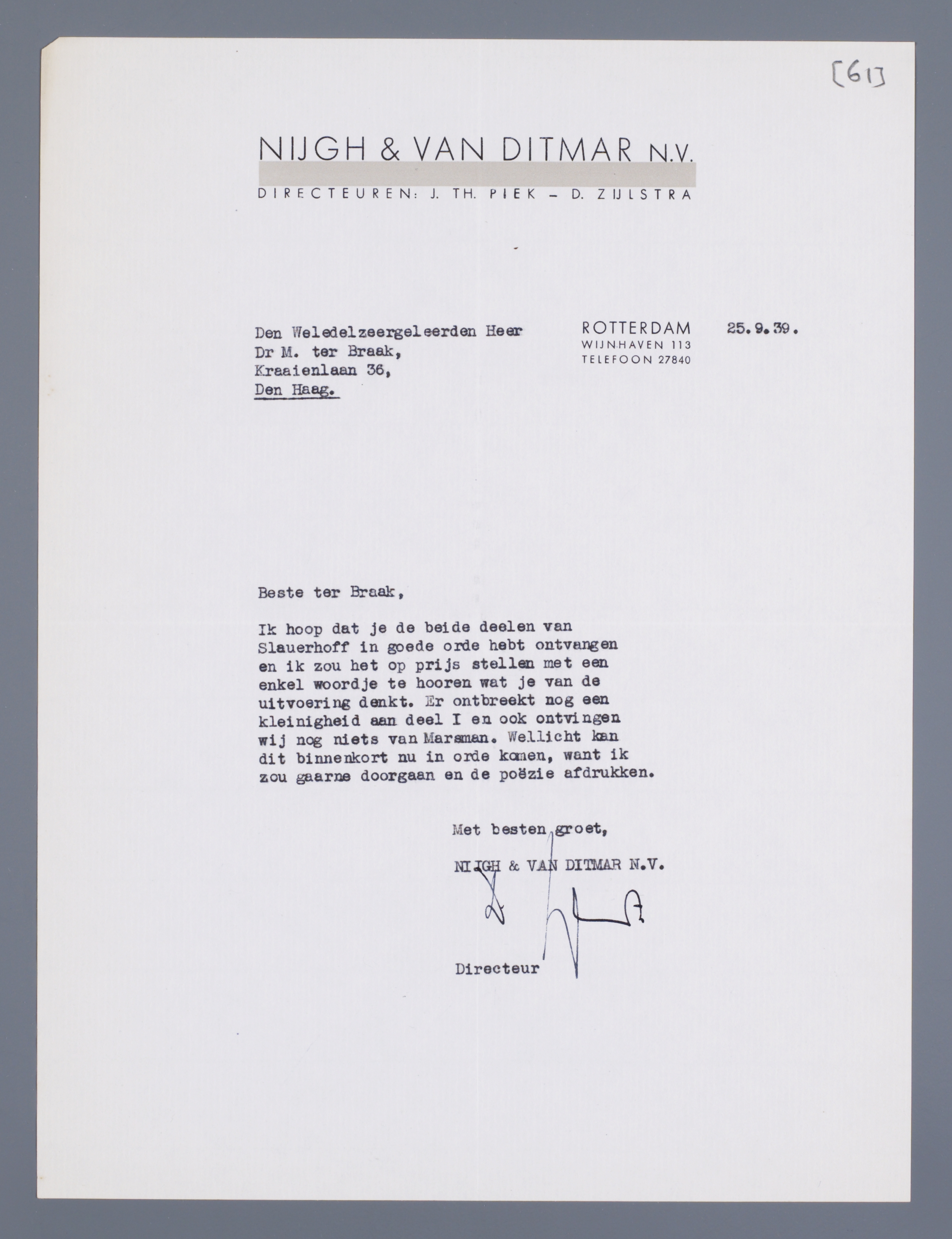 Ik hoop dat je de beide deelen van Slauerhoff in goede orde hebt ontvangen en ik zou het op prijs stellen met een enkel woordje te hooren wat je van de uitvoering denkt. Er ontbreekt nog een kleinigheid aan deel I en ook ontvingen wij nog niets van Marsman. Wellicht kan dit binnenkort nu in orde komen, want ik zou gaarne doorgaan en de poëzie afdrukken.