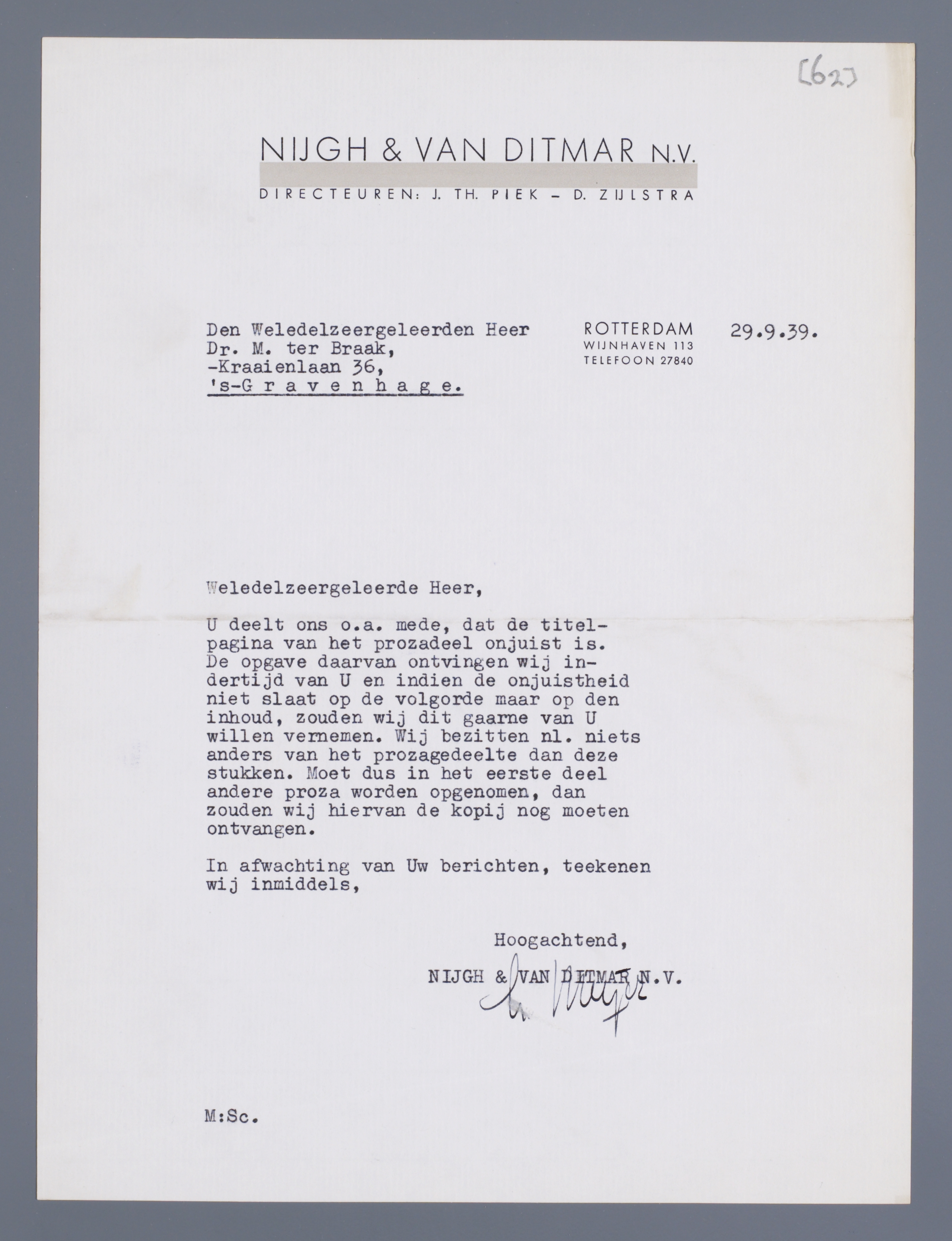 U deelt ons o.a. mede dat de titelpagina van het prozadeel onjuist is. De opgave daarvan ontvingen wij indertijd van U en indien de onjuistheid niet slaat op de volgorde maar op den inhoud, zouden wij dit gaarne van U willen vernemen. Wij bezitten nl. niets anders van het prozagedeelte dan deze stukken. Moet dus in het eerste deel andere proza worden opgenomen, dat zouden wij hiervan de kopij nog moeten ontvangen.