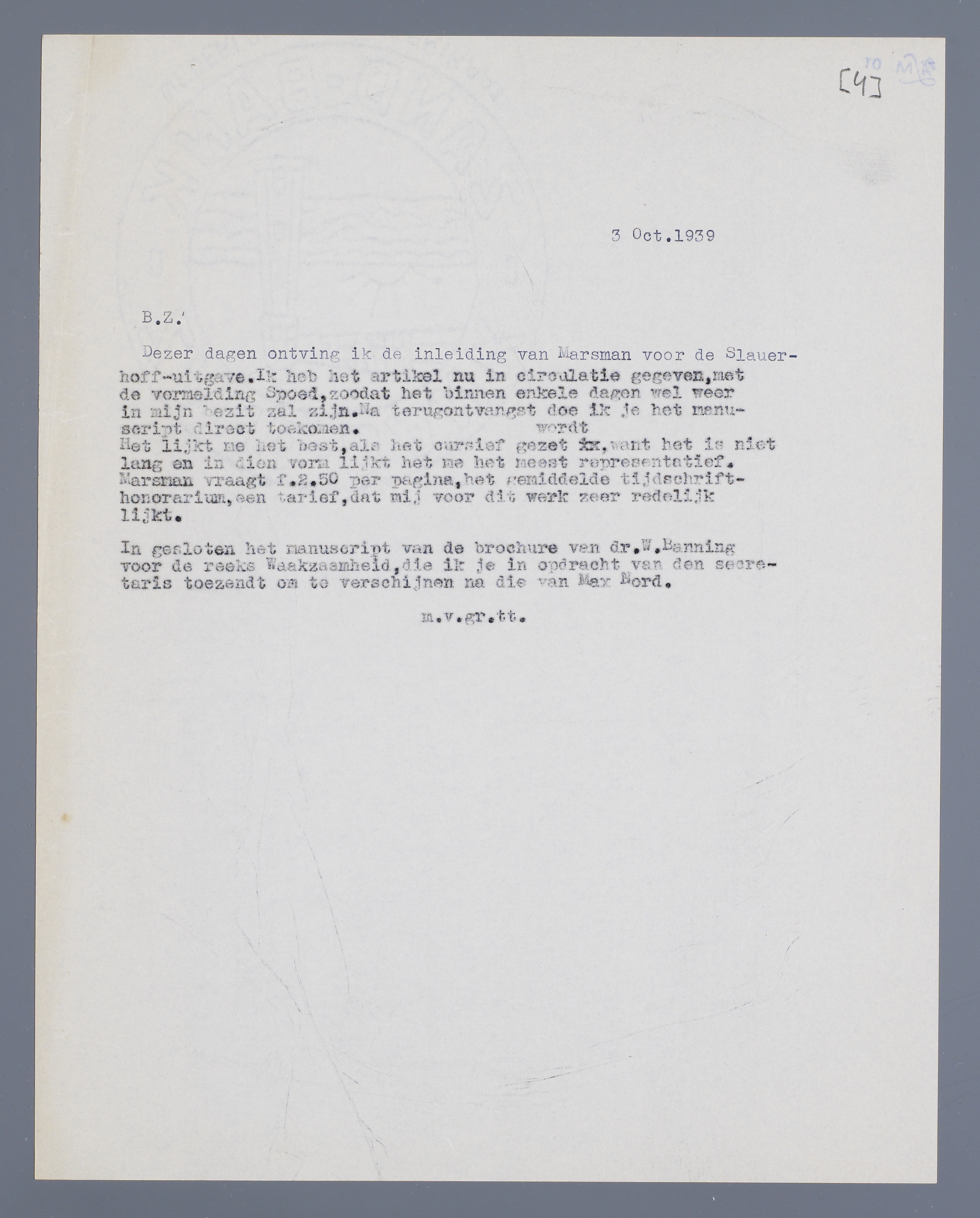 Marsman vraagt f2.50 per pagina, het gemiddelde tijdschrifthonorarium, een tarief, dat mij voor dit werk zeer redelijk lijkt.