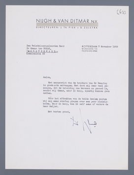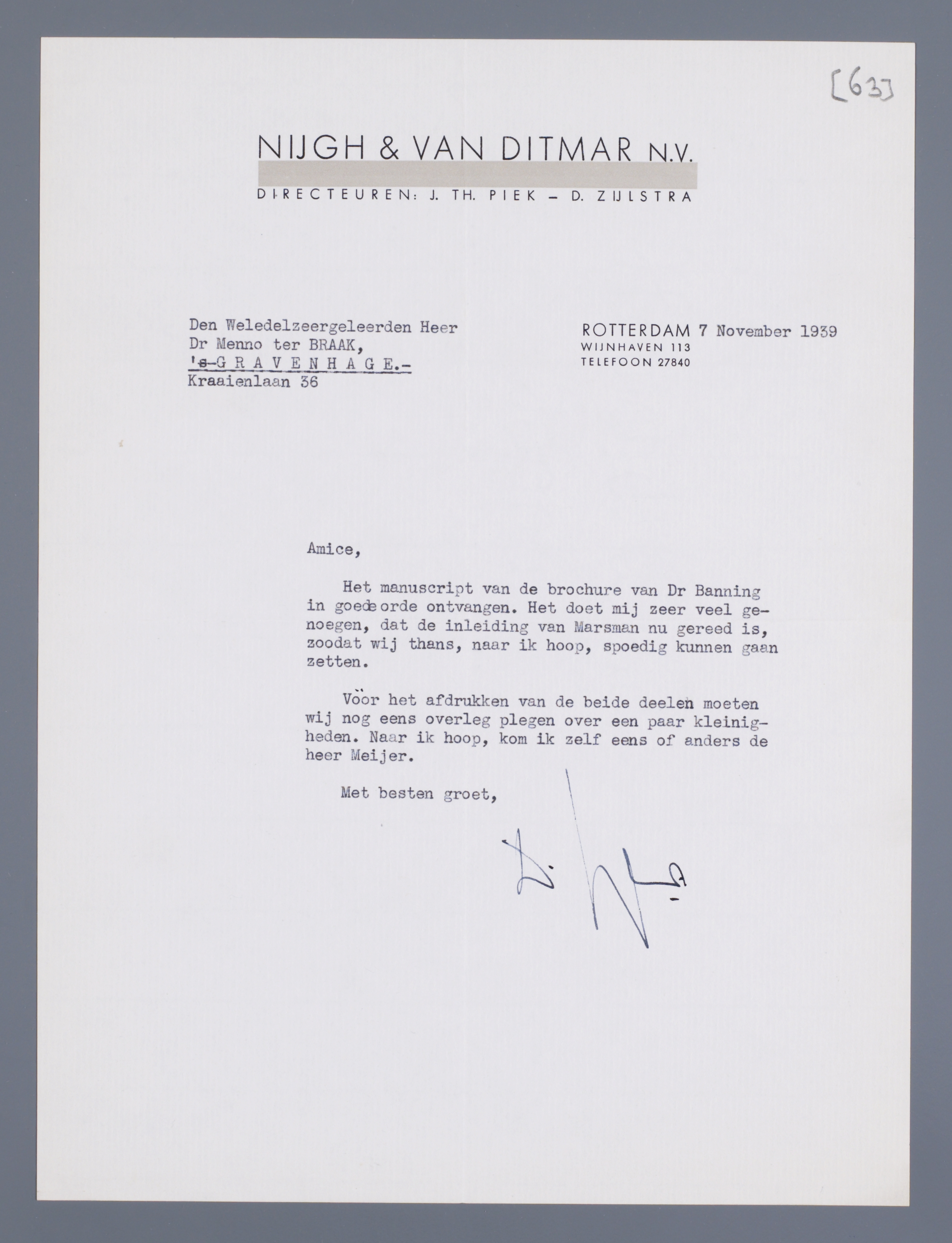 Het manuscript van de brochure van Dr Banning in goede orde ontvangen. Het doet mij zeer veel genoegen, dat de inleiding van Marsman nu gereed is, zoodat wij thans, naar ik hoop, spoedig kunnen gaan zetten.