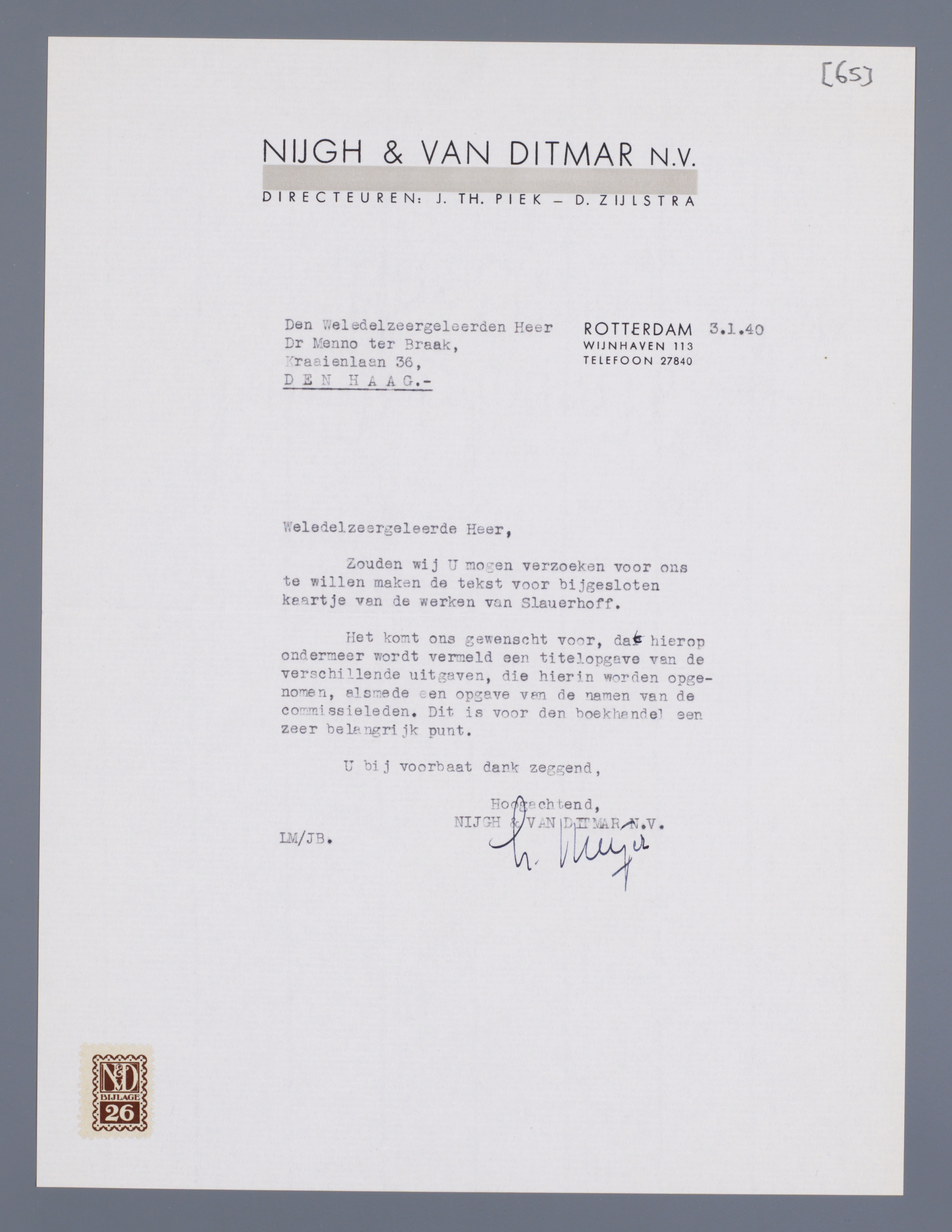 Zouden wij U mogen verzoeken voor ons te willen maken de tekst voor bijgesloten kaartje van de werken van Slauerhoff?