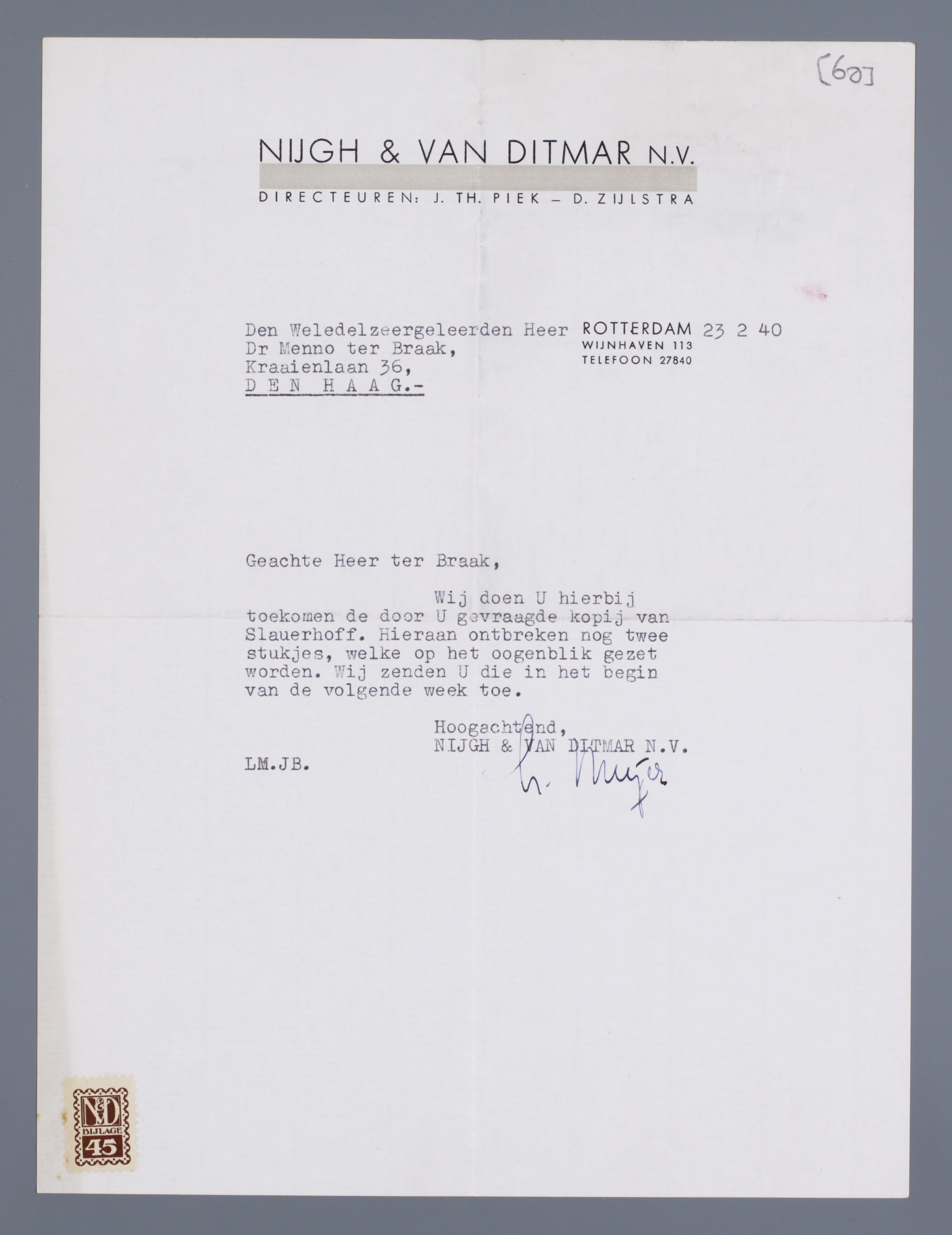 Wij doen U hierbij toekomen de door U gevraagde kopij van Slauerhoff. Hieraan ontbreken nog twee stukjes, welke op het oogenblik gezet worden. Wij sturen U die in het begin van de volgende week toe.