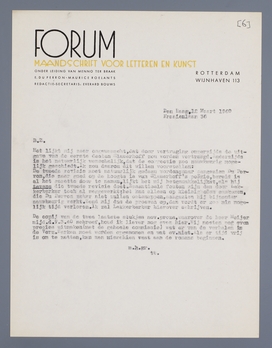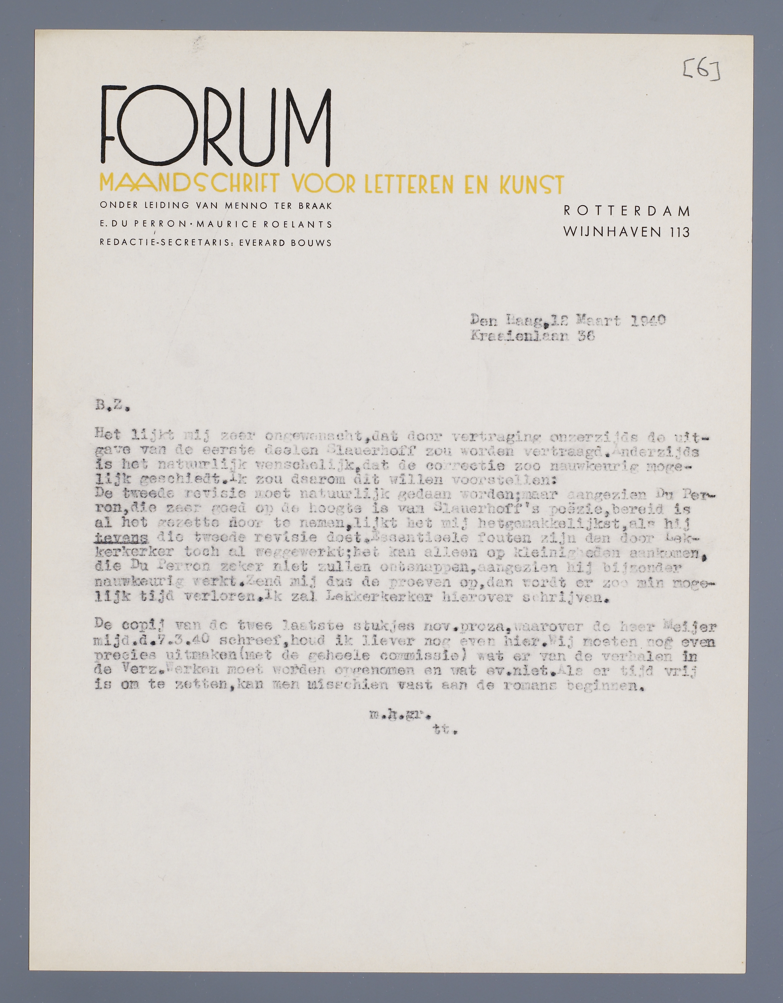 De copij van de twee laatste stukjes nov. proza, waarover de heer Meijer mij d.d. 7.3.40 schreef, houd ik liever nog even hier. Wij moeten nog even precies uitmaken (met de geheele commissie) wat er van de verhalen in de Verz. Werken moet worden opgenomen en wat ev. niet. Als er tijd vrij is om te zetten, kan men mischien vast aan de romans beginnen.
