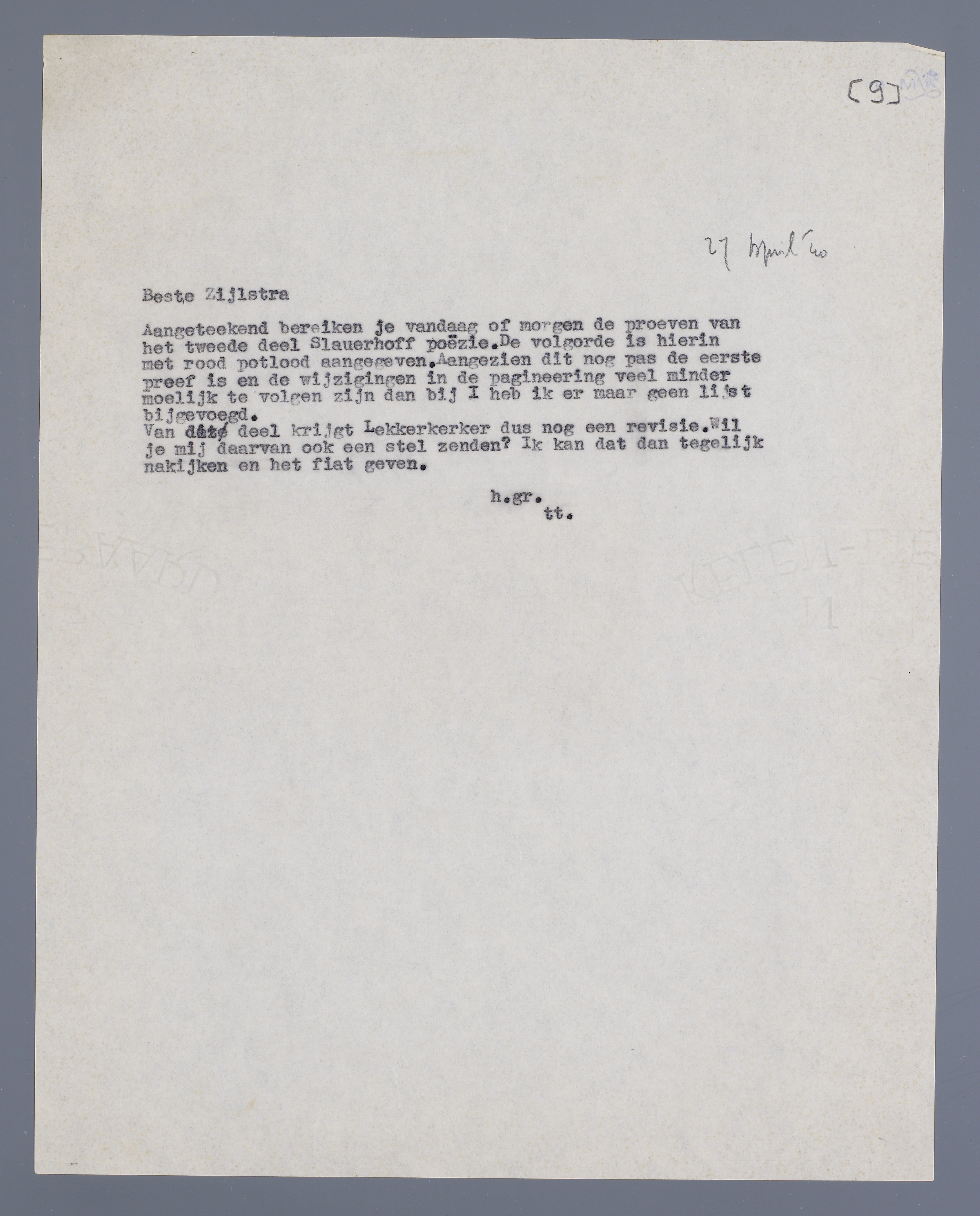 Aangeteekend bereiken je vandaag of morgen de proeven van het tweede deel Slauerhoff poëzie. De volgorde is hierin met rood potlood aangegeven. Aangezien dit nog pas de eerste proef is en de wijzigingen in de pagineering veel minder moeilijk te volgen zijn dan bij I heb ik er maar geen lijst bijgevoegd.