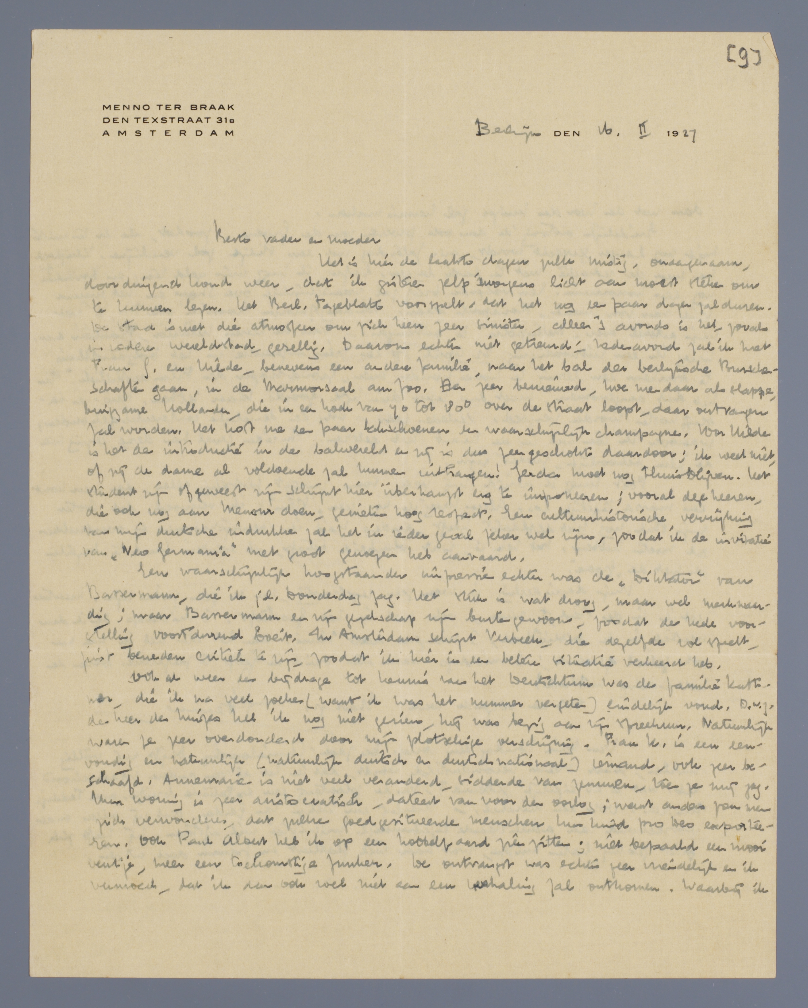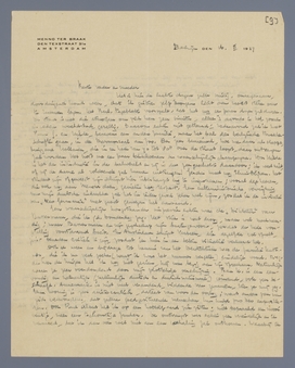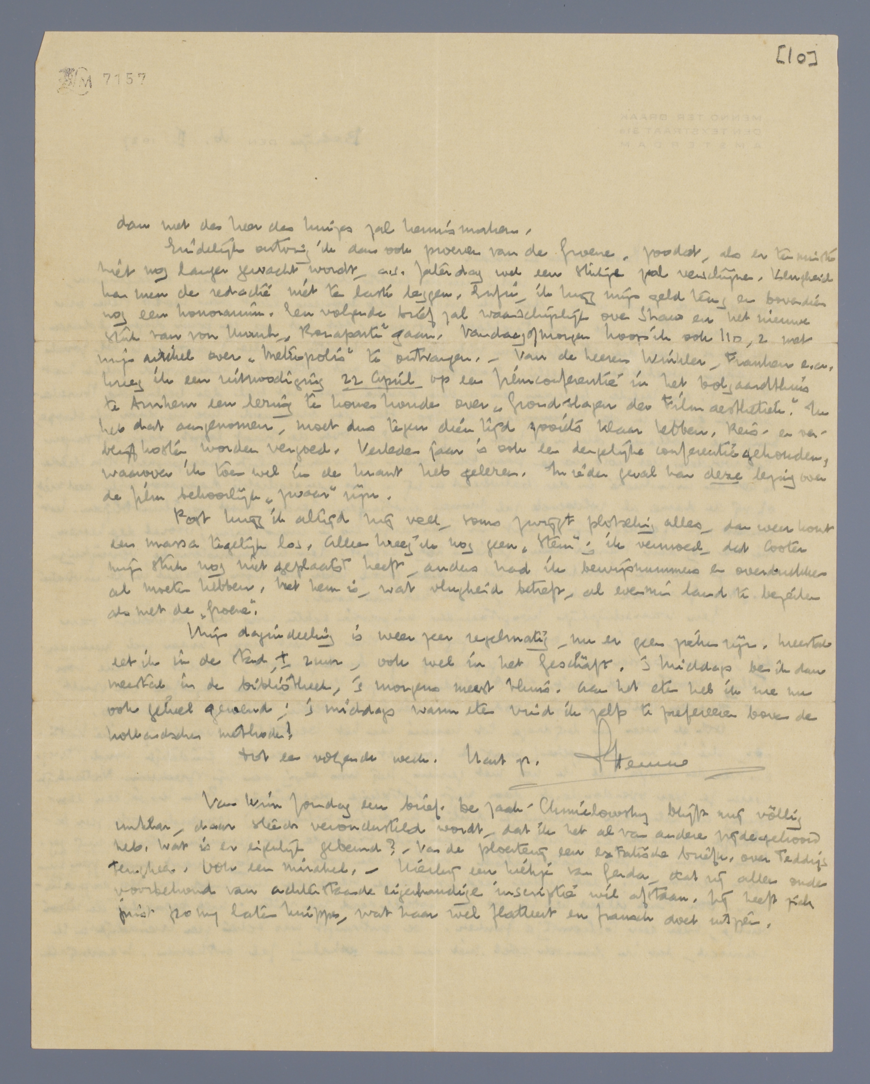 Eindelijk ontving ik dan ook proeven van de Groene, zoodat, als er tenminste niet nog langer gewacht wordt, a.s. Zaterdag wel een stukje zal verschijnen. Vlugheid kan men de redactie niet ten laste leggen. Enfin, ik krijg mijn geld terug en bovendien nog een honorarium. Een volgende brief zal waarschijnlijk over Shaw en het nieuwe stuk van von Unruh, ‘Bonaparte’ gaan. Vandaag of morgen hoop ik ook I10, 2 met mijn artikel over ‘Metropolis’ te ontvangen. - Van de heeren Winkler, Franken e.a. kreeg ik een uitnoodiging 22 April op een filmconferentie in het Oolgaardthuis te Arnhem een lezing te komen houden over ‘Grondslagen der Filmaesthetica’. Ik heb dat aangenomen, moet dus tegen dien tijd zooiets klaar hebben. Reis- en verblijfkosten worden vergoed. Verleden jaar is ook een dergelijke conferentie gehouden, waarover ik toen wel in de krant heb gelezen. In ieder geval kan deze lezing over de film behoorlijk ‘zwaar’ zijn.