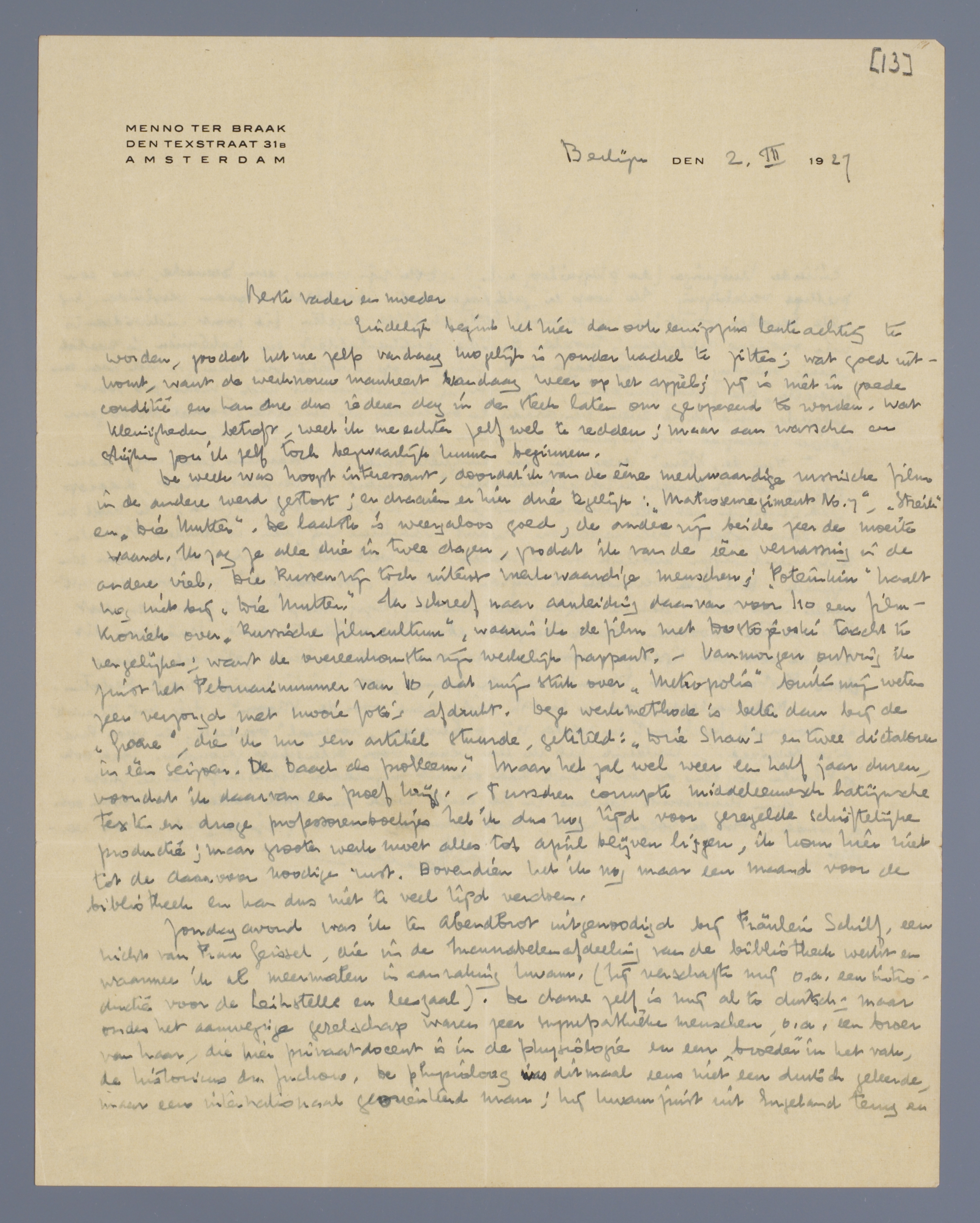 De week was hoogst interessant, doordat ik van de eene merkwaardige russische film in de andere werd gestort; er draaien er hier drie tegelijk: ‘Matrosenregiment No.7’, ‘Streik’ en ‘Die Mutter’. De laatste is weergaloos goed, de andere zijn beide zeer de moeite waard. Ik zag ze alle drie in twee dagen, zoodat ik van de ééne verrassing in de andere viel. Die Russen zijn toch uiterst merkwaardige menschen; ‘Potemkin’ haalt nog niet bij ‘Die Mutter’. Ik schreef naar aanleiding daarvan voor I10 een filmkroniek over ‘Russische filmcultuur’, waarin ik de film met Dostojevski tracht te vergelijken; want de overeenkomsten zijn werkelijk frappant. - Vanmorgen ontving ik juist het Februarinummer van I10, dat mijn stuk over ‘Metropolis’ buiten mijn weten zeer verzorgd met mooie foto's afdrukt. Deze werkmethode is beter dan bij de ‘Groene’, die ik nu een artikel stuurde, getiteld: ‘Drie Shaw's en twee dictatoren in één seizoen. De Daad als probleem’. Maar het zal wel weer een half jaar duren, voordat ik daarvan een proef krijg. - Tusschen corrupte middeleeuwsche Latijnsche texten en droge professorenboekjes heb ik dus nog tijd voor geregelde schriftelijke productie; maar grooter werk moet alles tot April blijven liggen, ik kom hier niet tot de daarvoor noodige rust. Bovendien heb ik nog maar een maand voor de bibliotheek en kan dus niet te veel tijd verdoen.