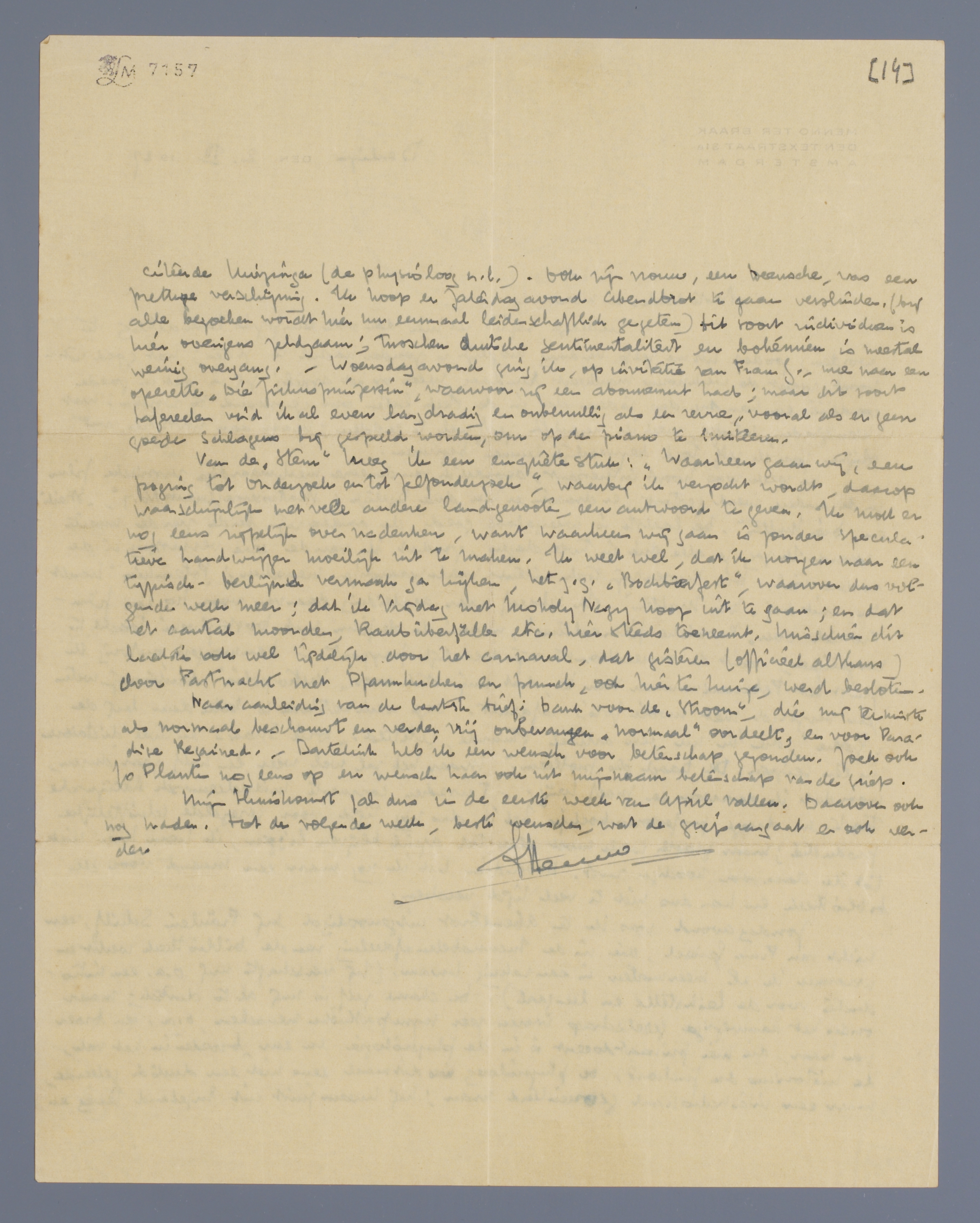 Van de ‘Stem’ kreeg ik een enquêtestuk: ‘Waarheen gaan wij’; een poging tot onderzoek en tot zelfonderzoek’, waarbij ik verzocht wordt, daarop waarschijnlijk met vele andere landgenooten, een antwoord te geven. Ik moet er nog eens rijpelijk over nadenken, want waarheen wij gaan is zonder speculatieve handwijzer moeilijk uit te maken. Ik weet wel, dat ik morgen naar een typisch berlijnsch vermaak ga kijken, het z.g. ‘Bockbierfest’, waarover dus volgende week meer; dat ik Vrijdag met Moholy Nagy hoop uit te gaan; en dat het aantal moorden, Raubüberfälle etc. hier steeds toeneemt. Misschien dit laatste ook wel tijdelijk door het carnaval, dat gisteren (officieel althans) door Fastnacht met Pfannkuchen en punch, ook hier ten huize, werd besloten.