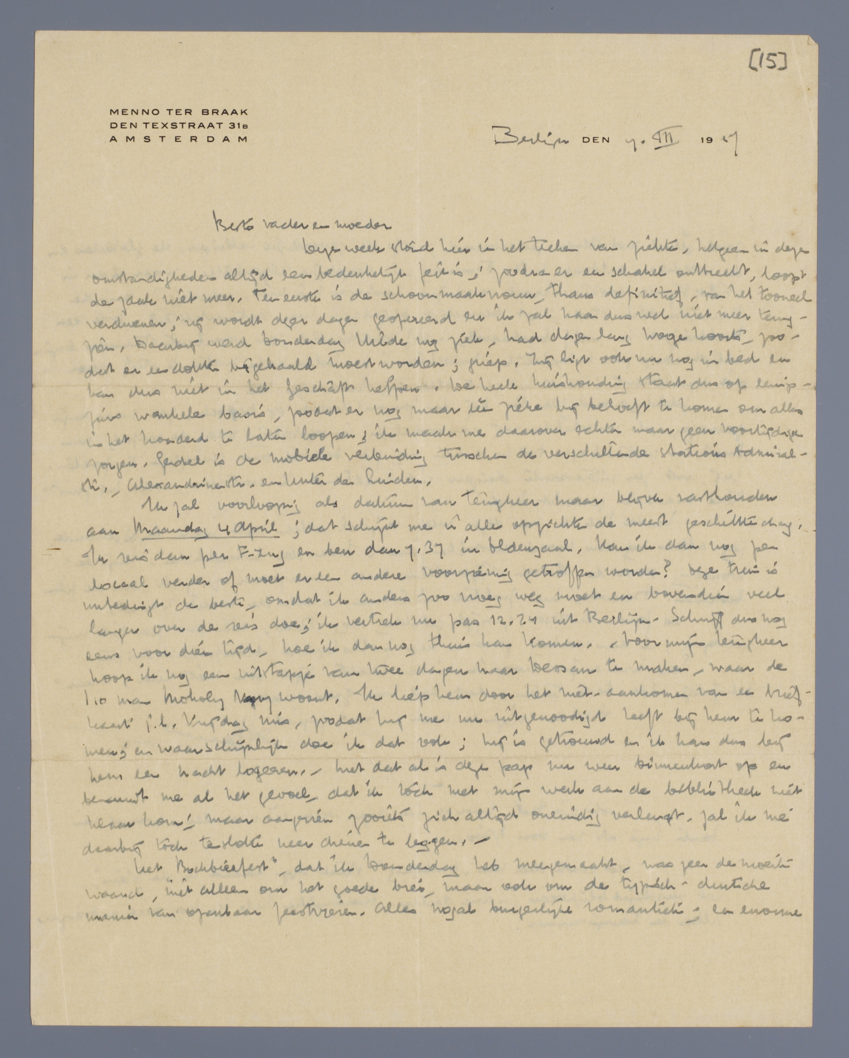 Ik zal voorloopig als datum van terugkeer maar blijven vasthouden aan Maandag 4 April; dat schijnt me in alle opzichten de meest geschikte dag. Ik reis dan per F-zug en ben dan 7.37 in Oldenzaal. Kan ik dan nog per locaal verder of moet er een andere voorziening getroffen worden? Deze trein is unbedingt de beste, omdat ik anders zoo vroeg weg moet en bovendien veel langer over de reis doe; ik vertrek nu pas 12.24 uit Berlijn. Schrijf dus nog eens voor dien tijd, hoe ik dan nog thuis kan komen. Voor mijn terugkeer hoop ik nog een uitstapje van twee dagen naar Dessau te maken, waar de I10 man Moholy Nagy woont. Ik liep hem door het niet-aankomen van de briefkaart j.l. Vrijdag mis, zoodat hij me nu uitgenoodigd heeft bij hem te komen; en waarschijnlijk doe ik dat ook; hij is getrouwd en ik kan dan bij hem een nacht logeeren. - Met dat al is deze pap nu weer binnenkort op en benauwt me al het gevoel, dat ik toch met mijn werk aan de bibliotheek niet klaar kom - maar aangezien zooiets zich altijd oneindig verlengt, zal ik me daarbij toch tenslotte neer dienen te leggen.