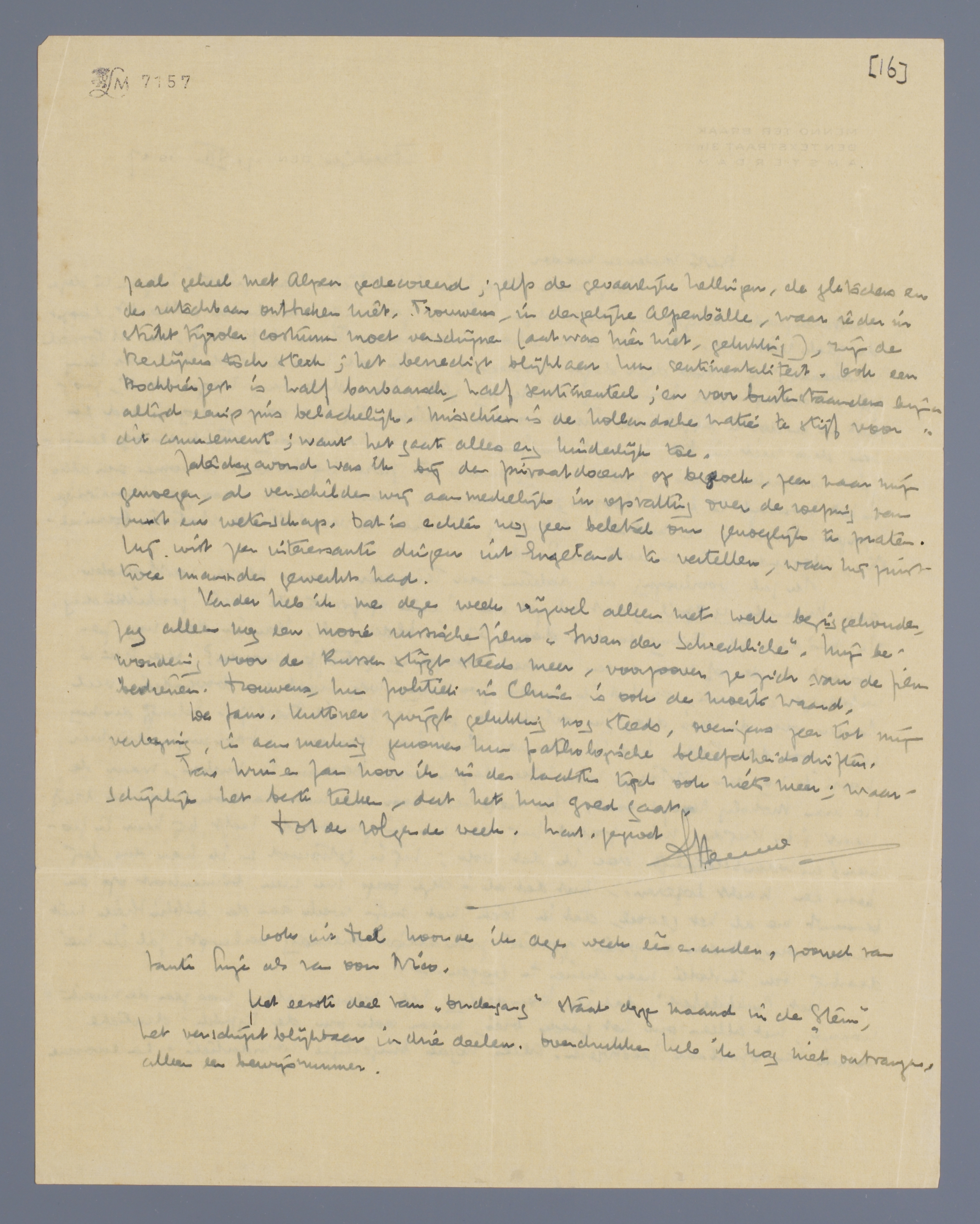 Zaterdagavond was ik bij de privaatdocent op bezoek, zeer naar mijn genoegen, al verschilden wij aanmerkelijk in opvatting over de roeping van kunst en wetenschap. Dat is echter nog geen beletsel om genoeglijk te praten. Hij wist zeer interessante dingen uit Engeland te vertellen, waar hij juist twee maanden gewerkt had.