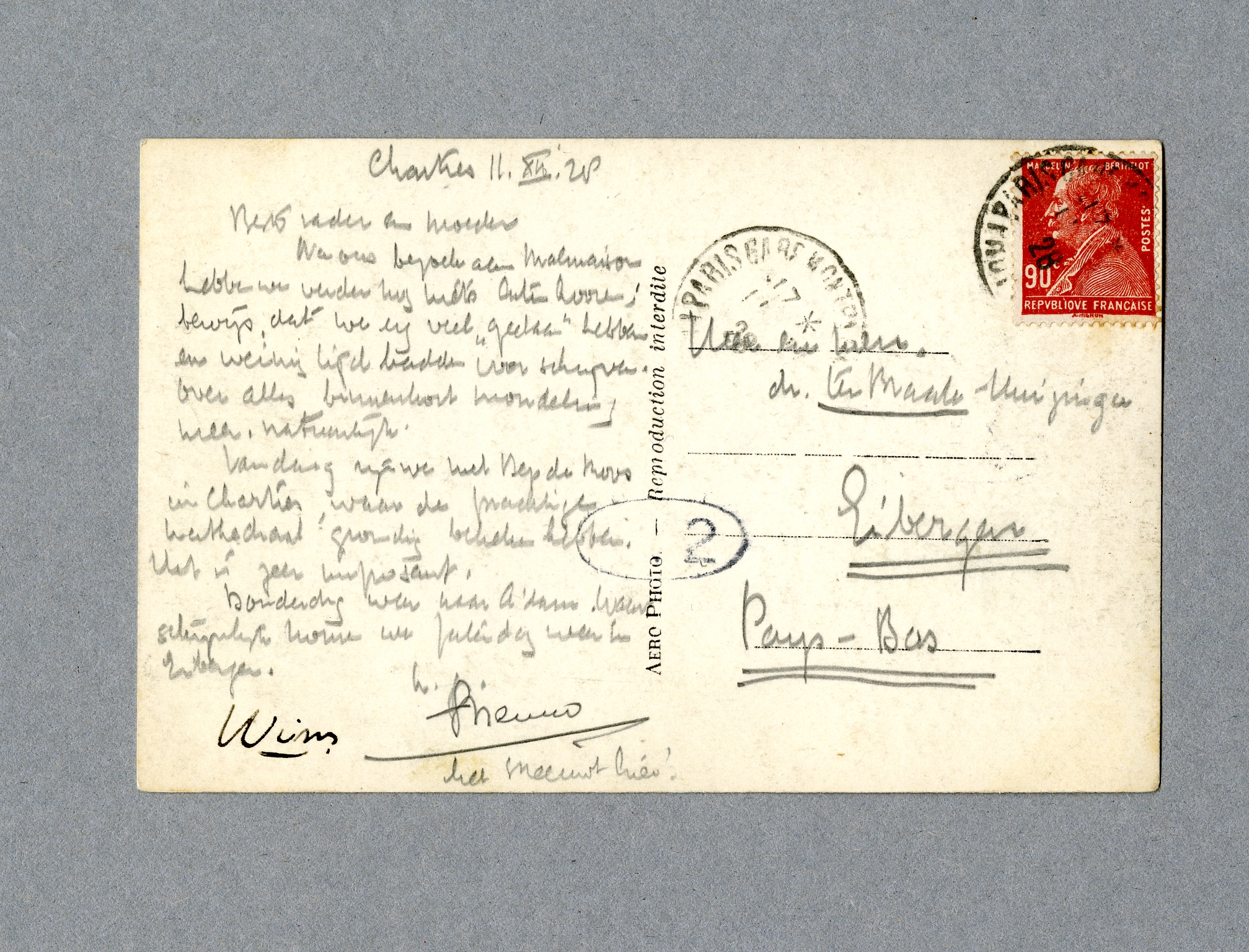 Vandaag zijn we met Bep de Roos in Chartres, waar [we] de prachtige cathedraal grondig bekeken hebben. Het is zeer imposant.