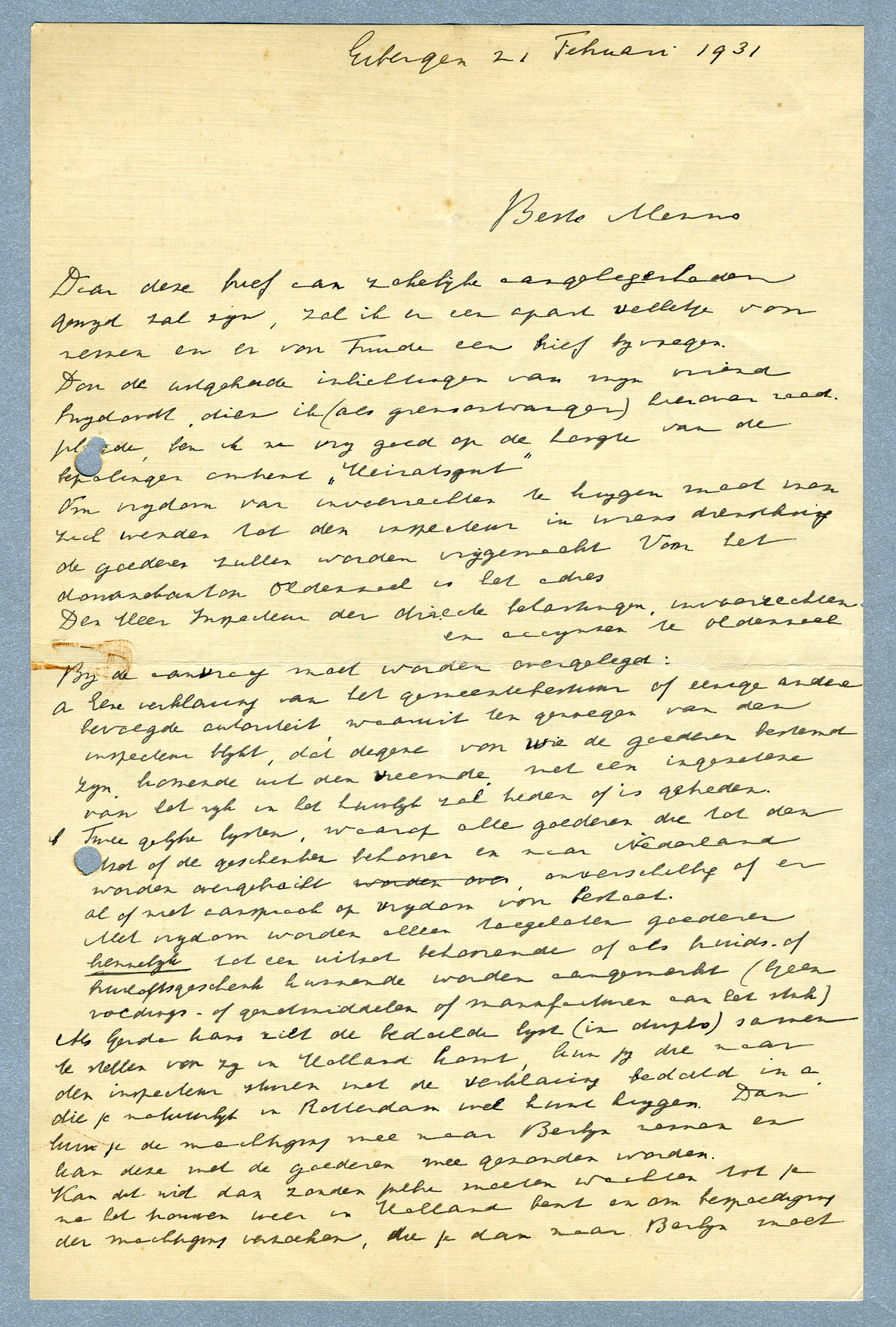 Als Gerda kans ziet de bedoelde lijst (in duplo) samen te stellen voor zij in Holland komt, kun jij die naar den inspecteur sturen met de verklaring bedoeld in a, die je natuurlijk in Rotterdam wel kunt krijgen. Dan kun je de machtiging mee naar Berlijn nemen en kan deze met de goederen mee gezonden worden.