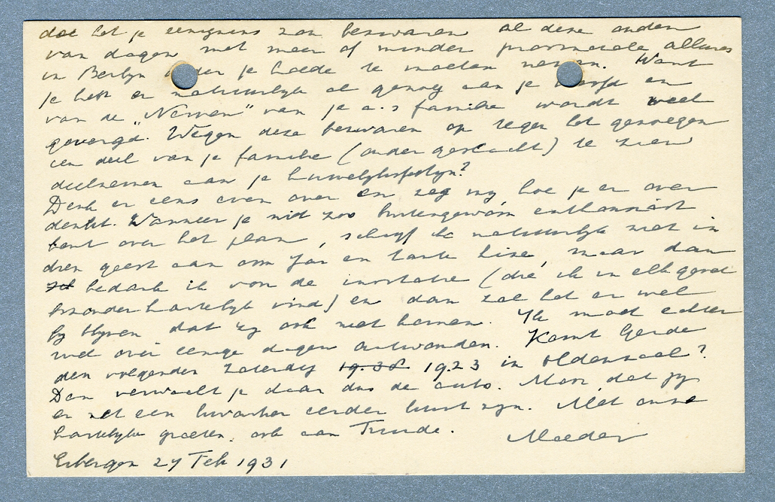 Denk er nog eens over en zeg mij hoe je er over denkt. Wanneer je niet zoo buitengewoon enthousiast bent over het plan, schrijf ik natuurlijk niet in dien geest aan oom Jan en tante Lize, maar dan bedank ik voor de invitatie (die ik in elke geval bizonder hartelijk vind) en dan zal het er wel bij blijven dat zij ook niet komen. Ik moet echter wel over eenige dagen antwoorden. Komt Gerda den volgenden Zaterdag 19.23 in Oldenzaal? Dan verwacht je daar dus de auto. Mooi dat jij er net een kwartier eerder kunt zijn.