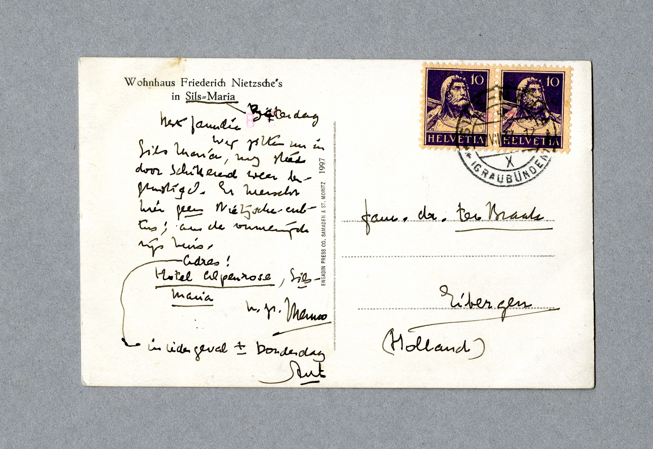 Wij zitten nu in Sils Maria, nog steeds door schitterend weer begunstigd. Er heerscht hier geen Nietzsche-cultus; aan de ommezijde zijn huis.