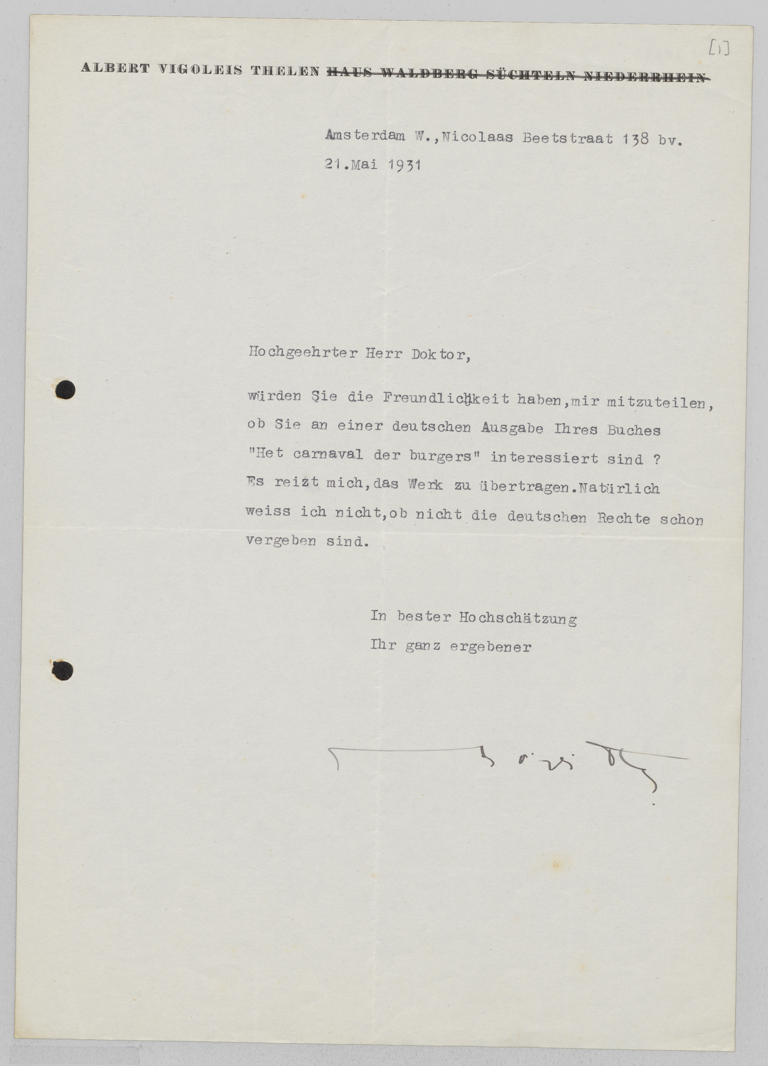 würden Sie die Freundlichkeit haben, mir mitzuteilen, ob Sie an einer deutschen Ausgabe Ihres Buches ‘Het carnaval der burgers’ interessiert sind? Es reizt mich, das Werk zu übertragen. Natürlich weiss ich nicht, ob nicht die deutschen Rechte schon vergeben sind.