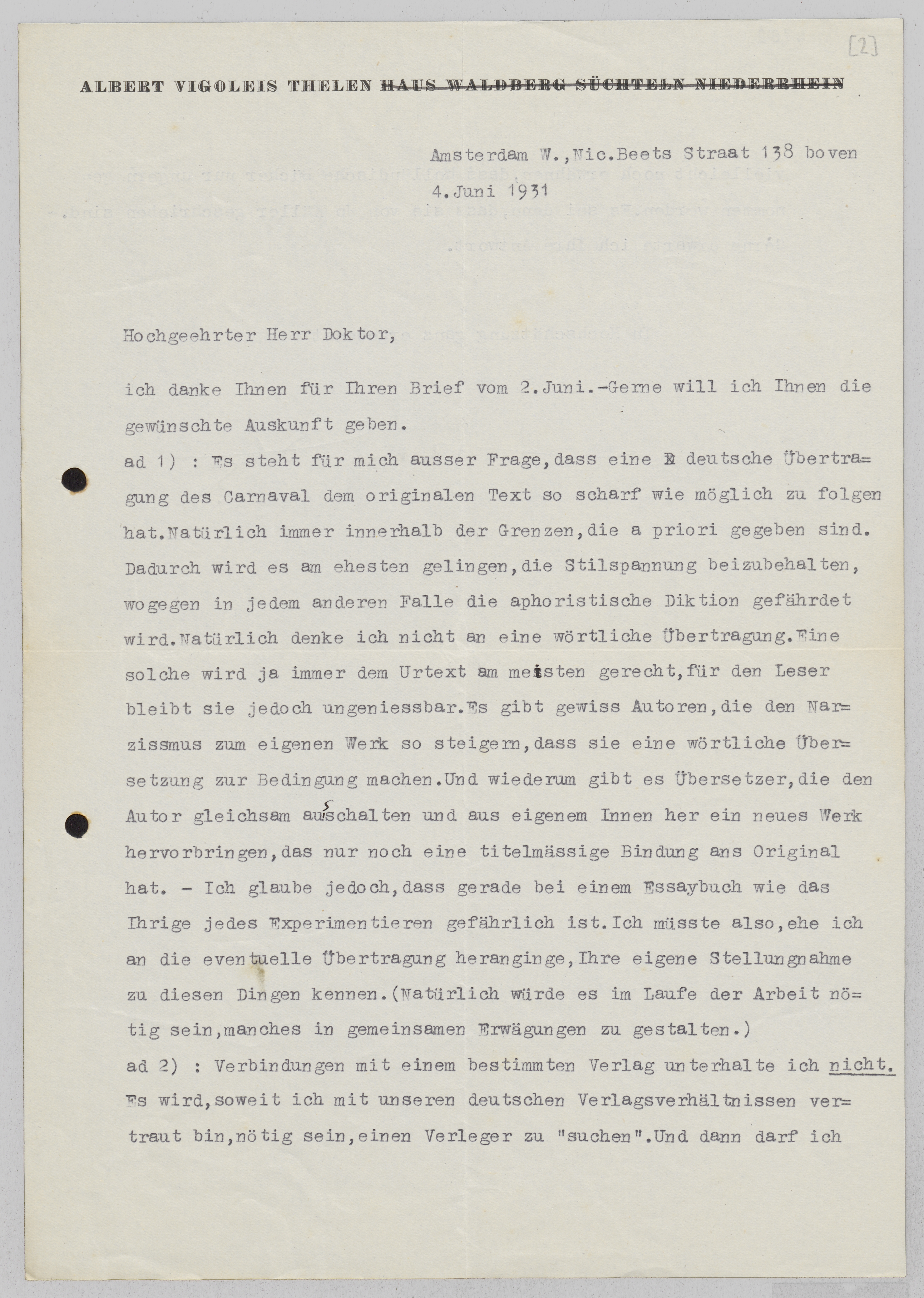 ad 1): Es steht für mich ausser Frage, dass eine deutsche Übertragung des Carnaval dem originalen Text so scharf wie möglich zu folgen hat. Natürlich immer innerhalb der Grenzen, die a priori gegeben sind. Dadurch wird es am ehesten gelingen, die Stilspannung beizubehalten, wogegen in jedem anderen Falle die aphoristische Diktion gefährdet wird. Natürlich denke ich nicht an eine wörtliche Übertragung. Eine solche wird ja immer dem Urtext am meisten gerecht, für den Leser bleibt sie jedoch ungeniessbar. Es gibt gewiss Autoren, die den Narzissmus zum eigenen Werk so steigern, dass sie eine wörtliche Übersetzung zur Bedingung machen. Und wiederum gibt es Übersetzer, die den Autor gleichsam ausschalten und aus eigenem Innen her ein neues Werk hervorbringen, das nur noch eine titelmässige Bindung ans Original hat. - Ich glaube jedoch, dass gerade bei einem Essaybuch wie das Ihrige jedes Experimentieren gefährlich ist. Ich müsste also, ehe ich an die eventuelle Übertragung heranginge, Ihre eigene Stellungnahme zu diesen Dingen kennen. (Natürlich würde es im Laufe der Arbeit nötig sein, manches in gemeinsamen Erwägungen zu gestalten.)