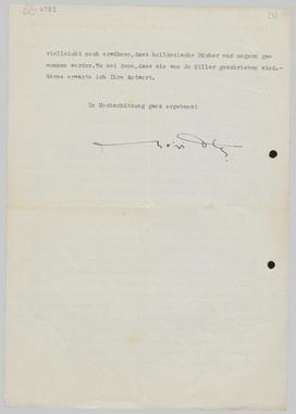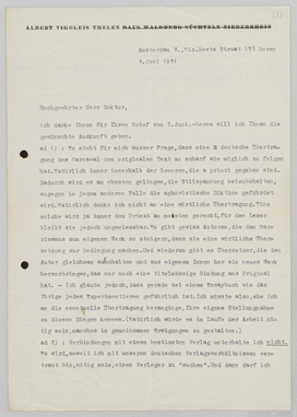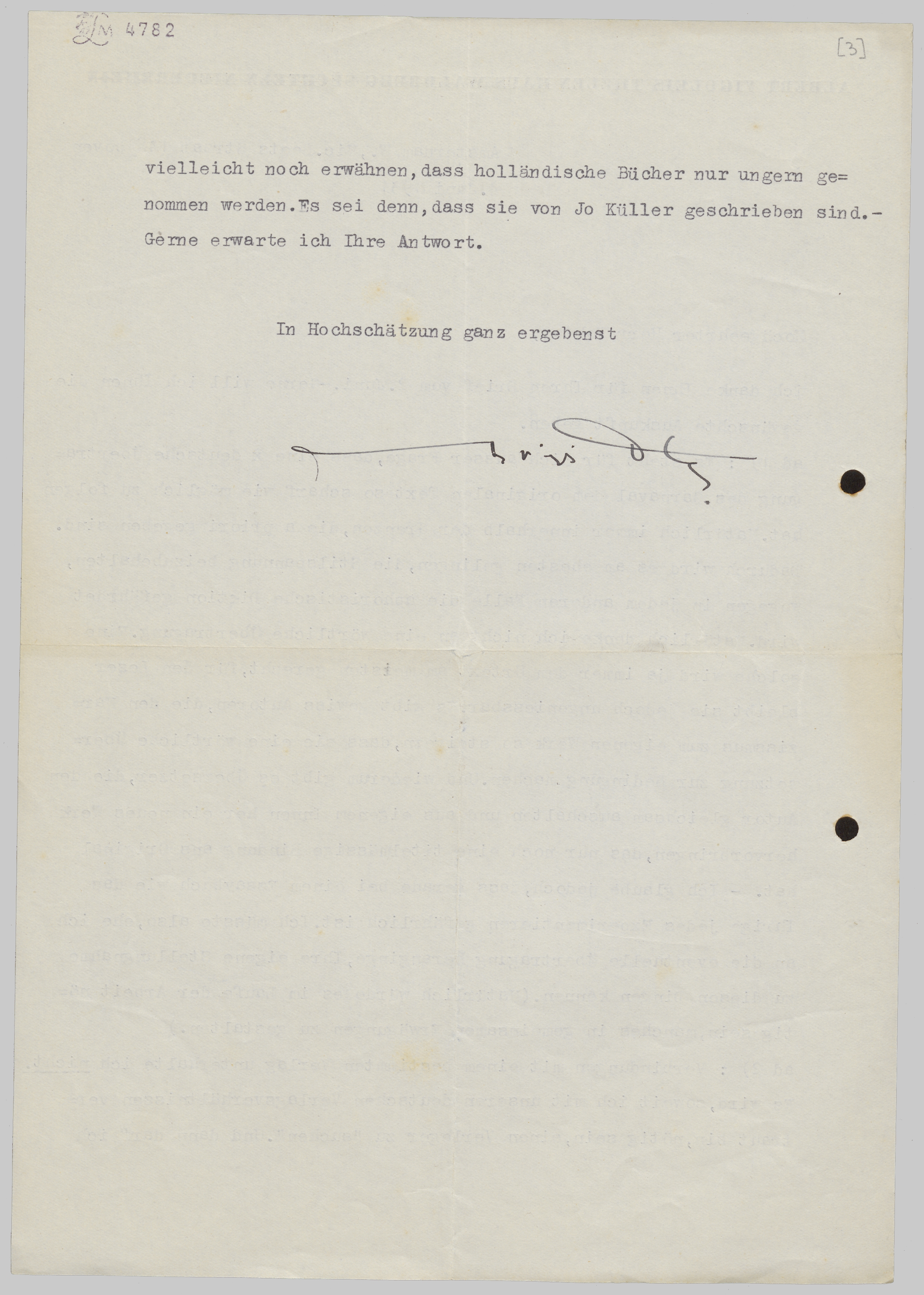 ad 2): Verbindungen mit einem bestimmten Verlag unterhalte ich nicht. Es wird, soweit ich mit unseren deutschen Verlagsverhältnissen vertraut bin, nötig sein, einen Verleger zu ‘suchen’. Und dann darf ich vielleicht noch erwähnen, dass holländische Bücher nur ungern genommen werden. Es sei denn, dass sie von Jo Küller geschrieben sind. -
