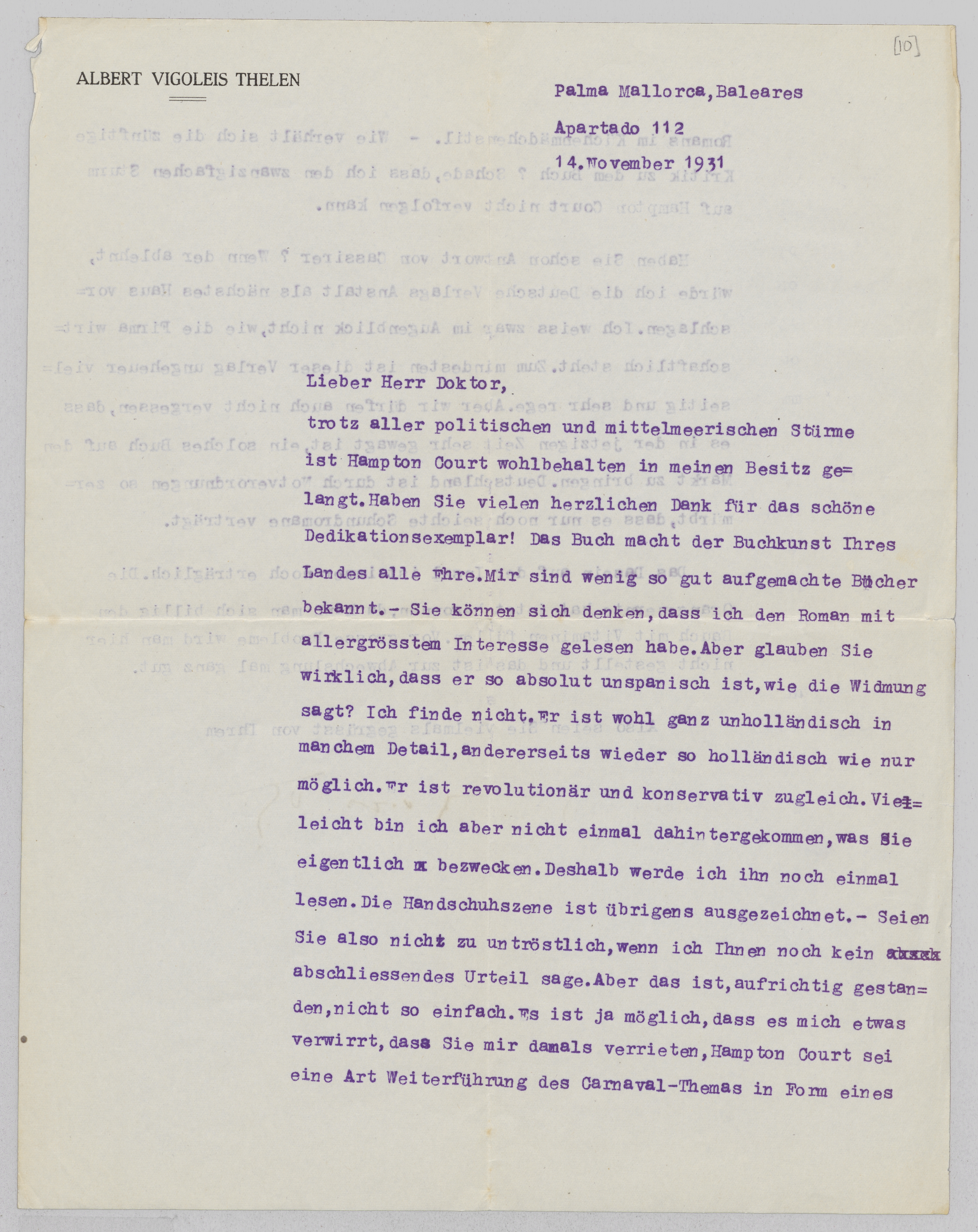 trotz aller politischen und mittelmeerischen Stürme ist Hampton Court wohlbehalten in meinen Besitz gelangt. Haben Sie vielen herzlichen Dank für das schöne Dedikationsexemplar! Das Buch macht der Buchkunst Ihres Landes alle Ehre. Mir sind wenig so gut aufgemachte Bücher bekannt. - Sie können sich denken, dass ich den Roman mit allergrösstem Interesse gelesen habe. Aber glauben Sie wirklich, dass er so absolut unspanisch ist, wie die Widmung sagt? Ich finde nicht. Er ist wohl ganz unhöllandisch in manchem Detail, andererseits wieder so höllandisch wie nur möglich. Er ist revolutionär und konservativ zugleich. Vielleicht bin ich aber nicht einmal dahintergekommen, was Sie eigentlich bezwecken. Deshalb werde ich ihn noch einmal lesen. Die Handschuhszene ist übrigens ausgezeichnet. - Seien Sie also nicht zu untröstlich, wenn ich Ihnen noch kein abschliessendes Urteil sage. Aber das ist, aufrichtig gestanden, nicht so einfach. Es ist ja möglich, dass es mich etwas verwirrt, dass Sie mir damals verrieten, Hampton Court sei eine Art Weiterführung des Carnaval-Themas im Form eines Romans im Küchenmädchenstil. - Wie verhält sich die zünftige Kritik zu dem Buch? Schade, dass ich den zwanzigfachen Sturm auf Hampton Court nicht vervolgen kann.