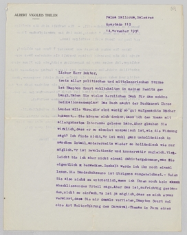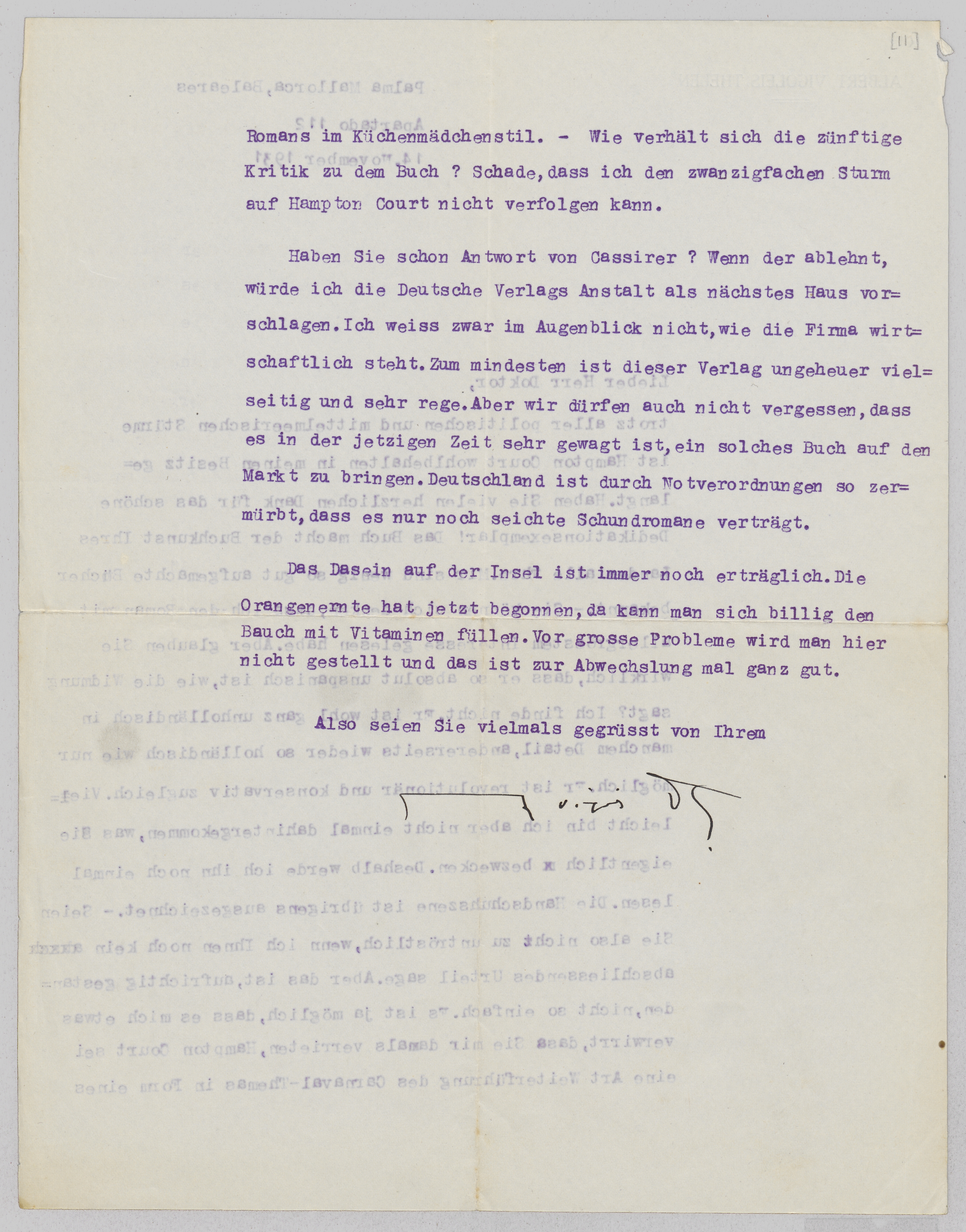 Haben Sie schon Antwort von Cassirer? Wenn der ablehnt, würde ich die Deutsche Verlags Anstalt als nächstes Haus vorschlagen. Ich weiss zwar im Augenblick nicht, wie die Firma wirtschaftlich steht. Zum mindesten ist dieser Verlag ungeheuer vielseitig und sehr rege. Aber wir dürfen auch nicht vergessen, dass es in der jetzigen Zeit sehr gewagt ist, ein solches Buch auf den Markt zu bringen. Deutschland ist durch Notverordnungen so zermürbt, dass es nur noch seichte Schundromane verträgt.