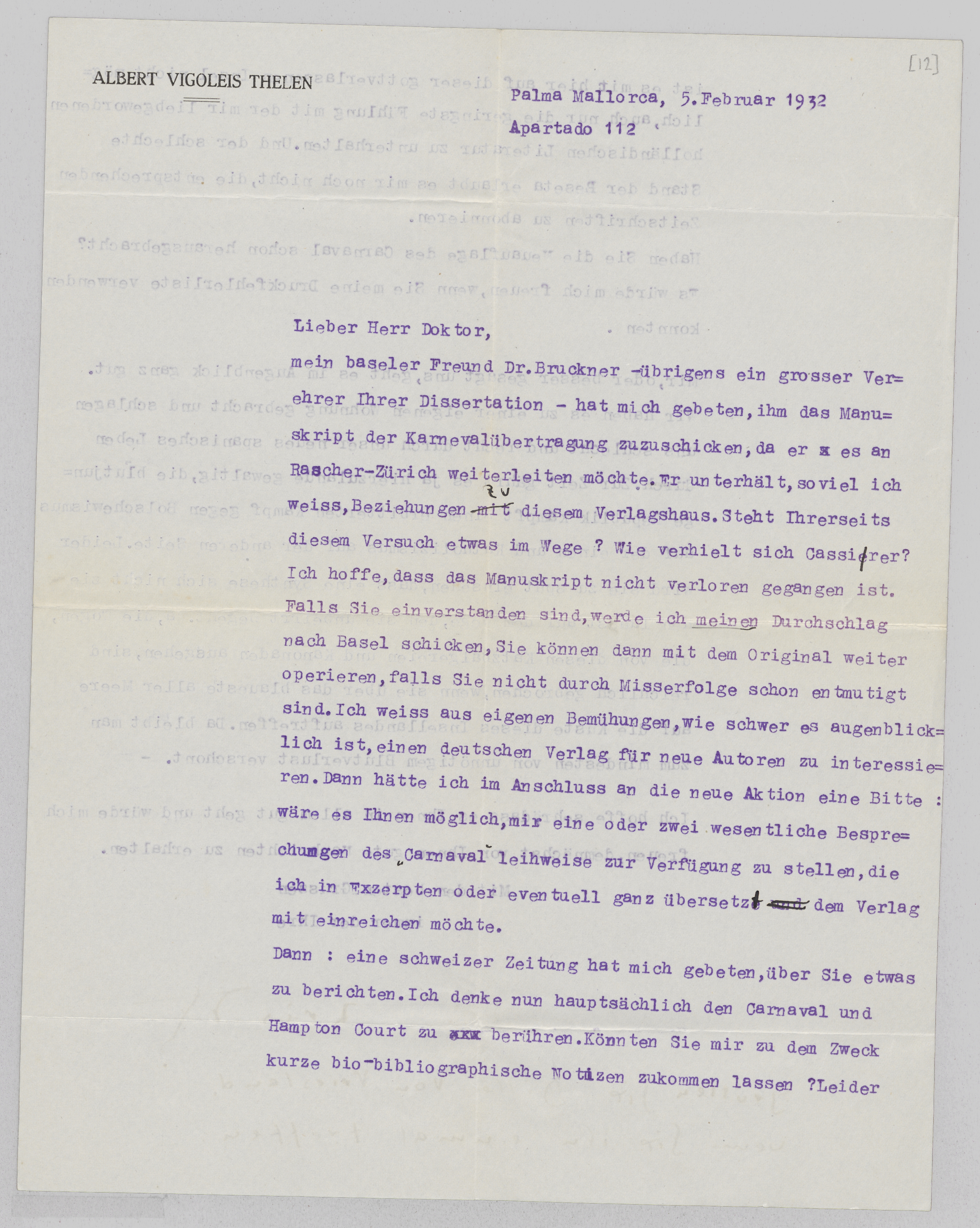 mein baseler Freund Dr.Bruckner - übrigens ein grosser Verehrer Ihrer Dissertation - hat mich gebeten, ihm das Manuskript der Karnevalübertragung zuzuschicken, da er es an Rascher-Zürich weiterleiten möchte. Er unterhält, soviel ich weiss, Beziehungen zu diesem Verlagshaus. Steht Ihrerseits diesem Versuch etwas im Wege? Wie verhielt sich Cassirer? Ich hoffe, dass das Manuskript nicht verloren gegangen ist. Falls Sie einverstanden sind, werde ich meinen Durchschlag nach Basel schicken, Sie können dann mit dem Original weiter operieren, falls Sie nicht durch Misserfolge schon entmutigt sind. Ich weiss aus eigenen Bemühungen, wie schwer es augenblicklich ist, einen deutschen Verlag für neue Autoren zu interessieren. Dann hätte ich im Anschluss an die neue Aktion eine Bitte: wäre es ihnen möglich, mir eine oder zwei wesentliche Besprechungen des ‘Carnaval’ leihweise zur Verfügung zu stellen, die ich in Exzerpten oder eventuell ganz übersetzt dem Verlag mit einreichen möchte.