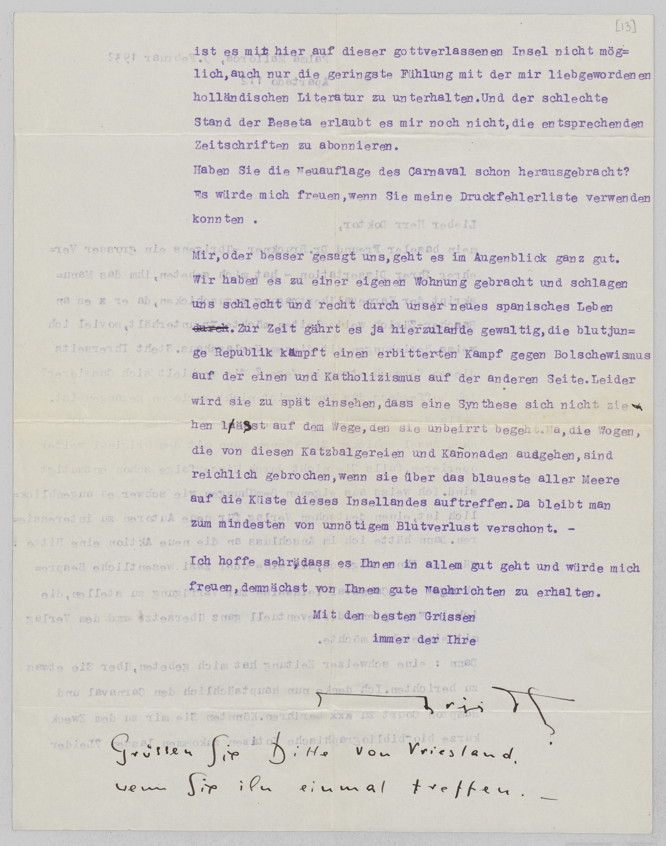 Dann: eine schweizer Zeitung hat mich gebeten, über Sie etwas zu berichten. Ich denke nun hauptsächlich den Carnaval und Hampton Court zu berühren. Könnten Sie mir zu dem Zweck kurze bio-bibliographische Notizen zukommem lassen? Leider ist es mir hier auf dieser gottverlassenen Insel nicht möglich, auch nur die geringste Fühlung mit der mir liebgewordenen holländischen Literatur zu unterhalten. Und der schlechte Stand der Peseta erlaubt es mir noch nicht, die entsprechenden Zeitschriften zu abonnieren.