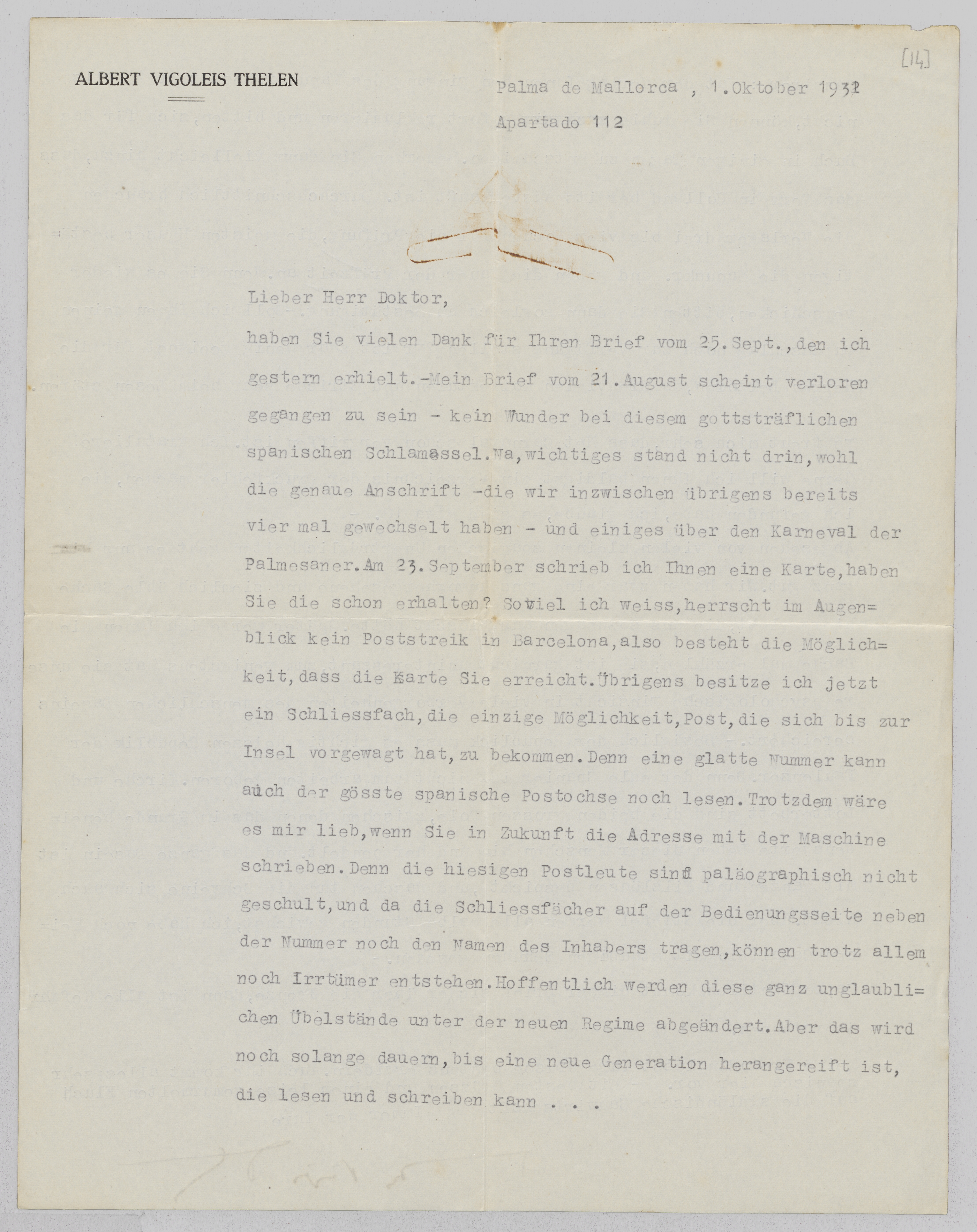 haben Sie vielen Dank für Ihren Brief vom 25.Sept., den ich gestern erhielt. - Mein Brief vom 21.August scheint verloren gegangen zu sein - kein Wunder bei diesem gottsträflichen spanischen Schlamassel. Na, wichtiges stand nicht drin, wohl die genaue Anschrift - die wir inzwischen übrigens bereits vier mal gewechselt haben - und einiges über den Karneval der Palmesaner. Am 23.September schrieb ich Ihnen eine Karte, haben Sie die schon erhalten? Soviel ich weiss, herrscht im Augenblick kein Poststreik in Barcelona, also besteht die Möglichkeit, dass die Karte Sie erreicht. Übrigens besitze ich jetzt ein Schliesfach, die einzige Möglichkeit, Post, die sich bis zur Insel vorgewagt hat, zu bekommen. Denn eine glatte Nummer kann auch der grösste spanische Postochse noch lesen. Trotzdem wäre es mir lieb, wenn Sie in Zukunft die Adresse mit der Maschine schrieben. Denn die hiesigen Postleute sing paläographisch nicht geschult, und da die Schliessfächer auf der Bedienungsseite neben der Nummer noch den Namen des Inhabers tragen, können trotz allem noch Irrtümer entstehen. Hoffentlich werden diese ganz unglaublichen Übelstände unter der neuen Regime abgeändert. Aber das wird noch solange dauern, bis eine neue Generation herangereift ist, die lesen und schreiben kann ...