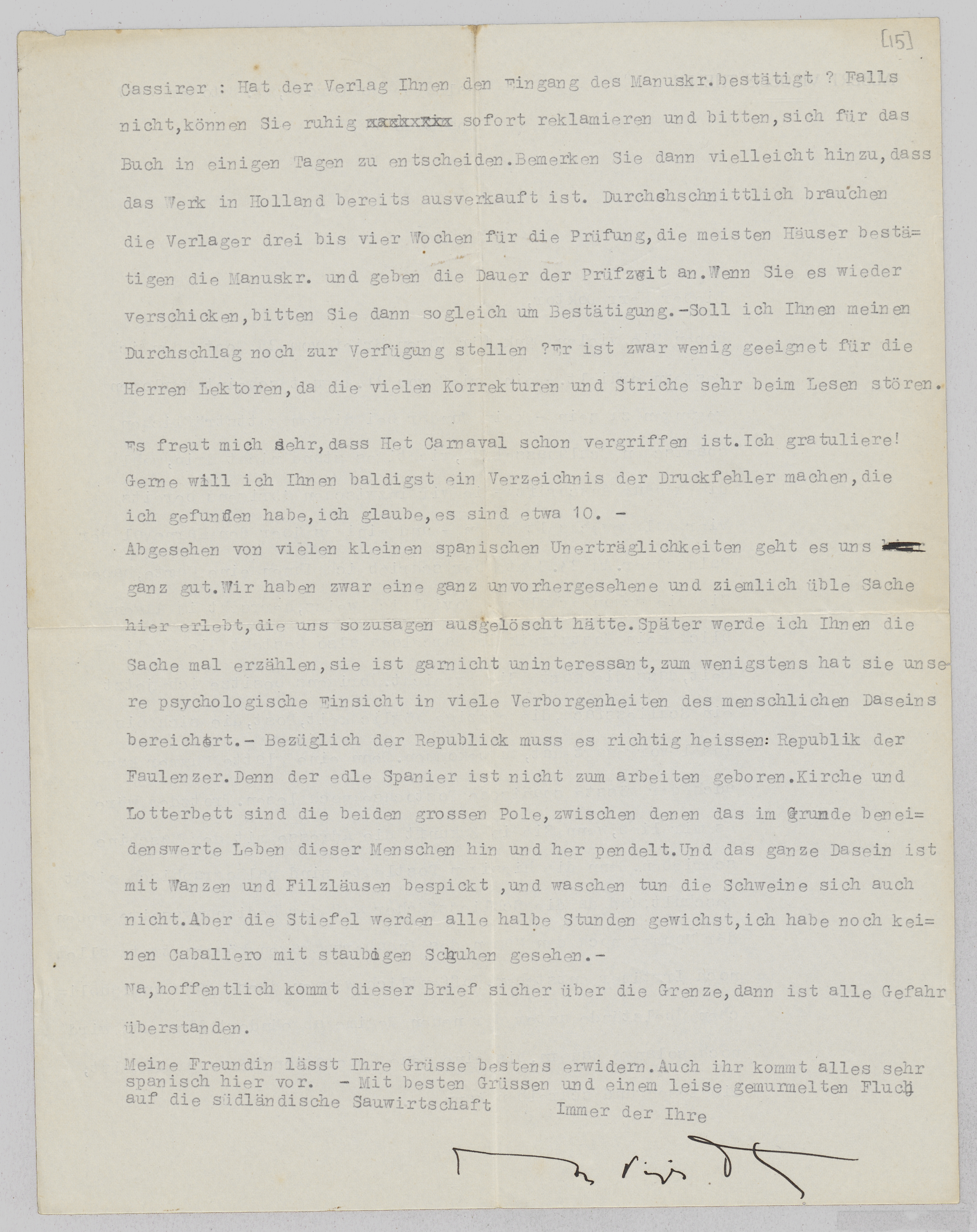 Cassirer: Hat der Verlag Ihnen den Eingang des Manuskr. bestätigt? Falls nicht, können Sie ruhig sofort reklamieren und bitten, sich für das Buch in einigen Tagen zu entscheiden. Bemerken Sie dann vielleicht hinzu, dass das Werk in Holland bereits ausverkauft ist. Durchschnittlich brauchen die Verlager drei bis vier Wochen für die Prüfung, die meisten Häuser bestätigen die Manuskr. und geben die Dauer der Prüfzeit an. Wenn Sie es wieder verschicken, bitten Sie dann sogleich um Bestätigung. - Soll ich Ihnen meinen Durchschlag noch zur Verfügung stellen? Er ist zwar wenig geeignet für die Herren Lektoren, da die vielen Korrekturen und Striche sehr beim lesen stören.