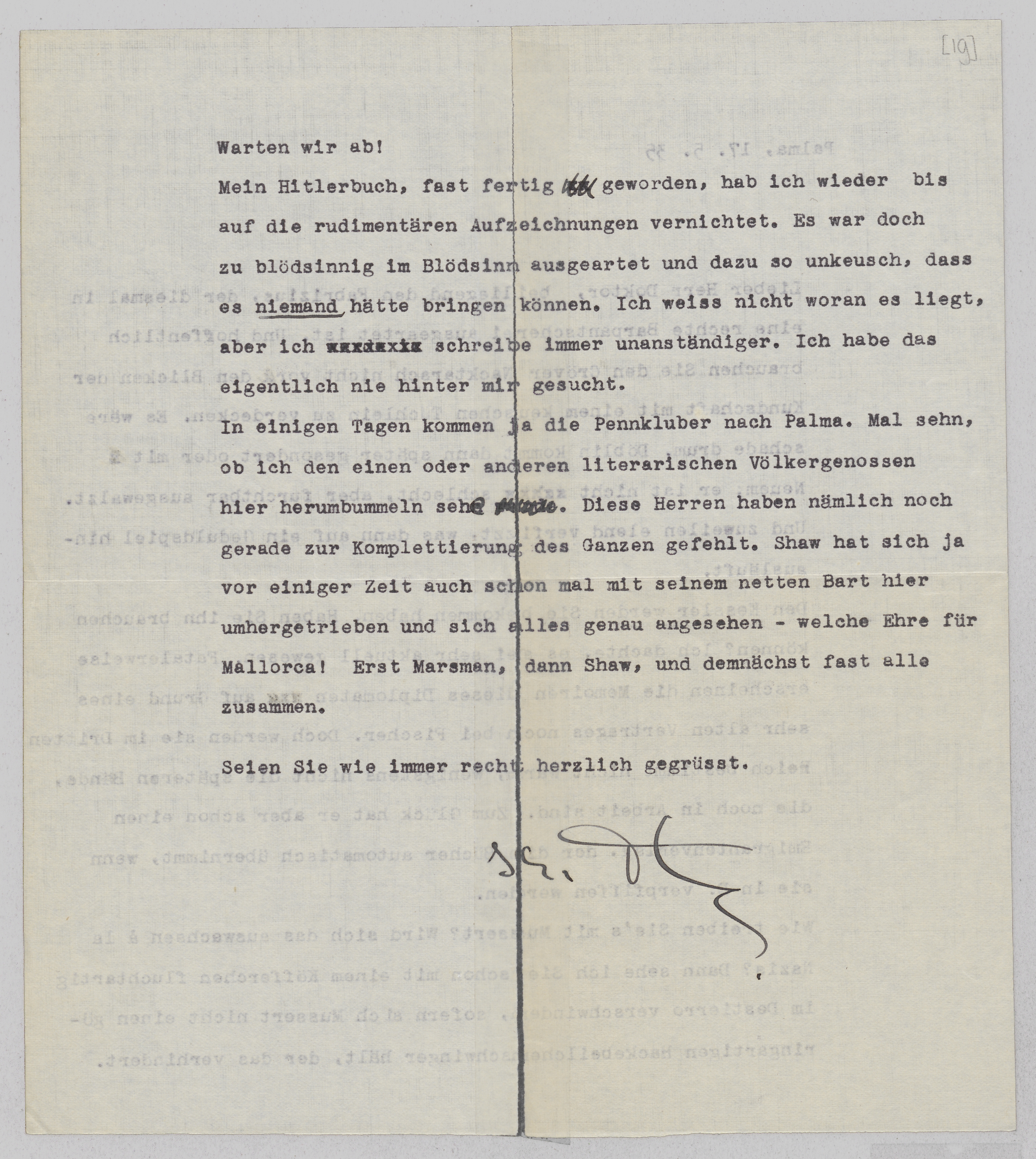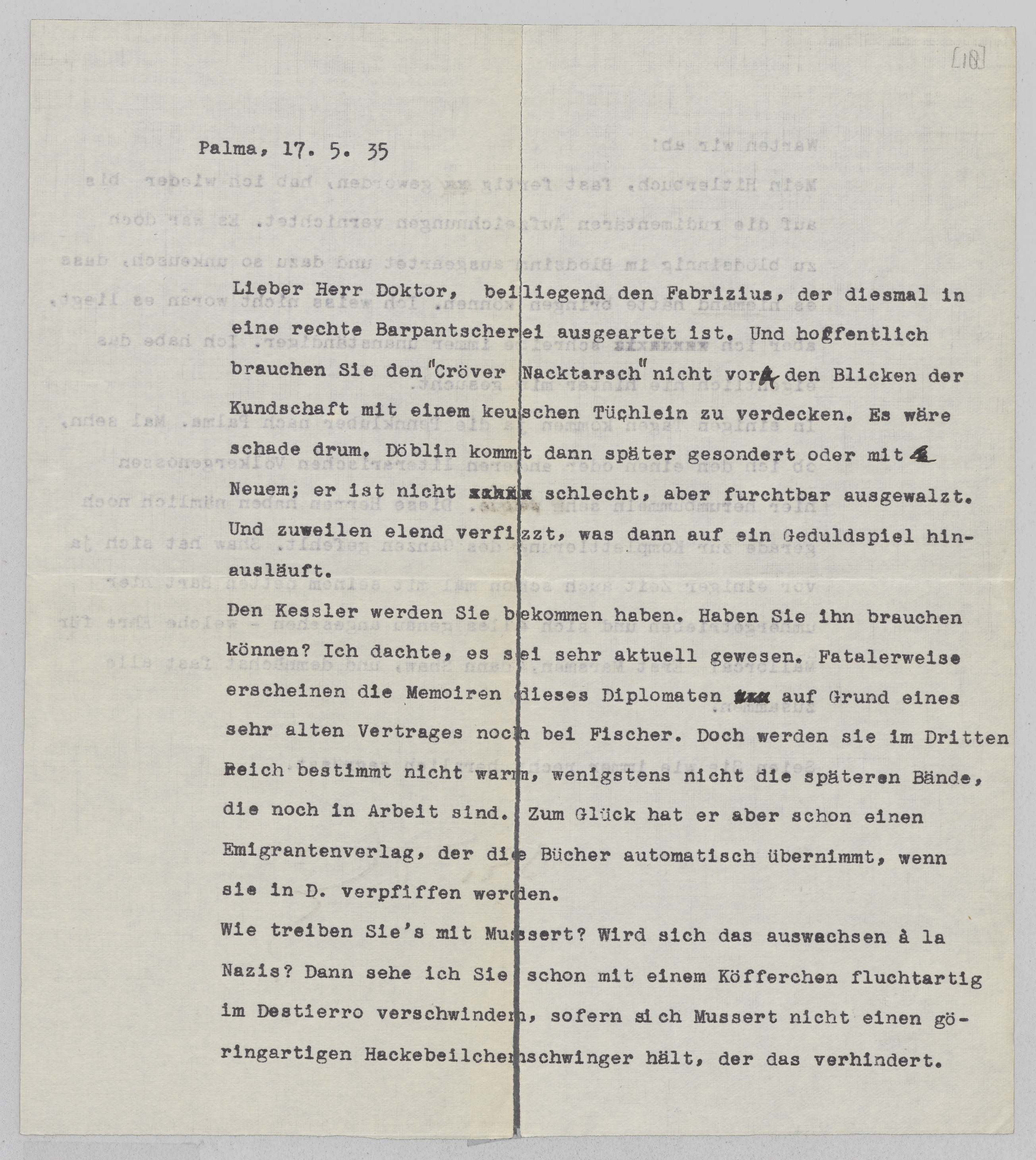 beiliegend den Fabrizius, der diesmal in eine rechte Barpantscherei ausgeartet ist. Und hoffentlich brauchen Sie den ‘Cröver Nacktarsch’ nicht von den Blicken der Kundschaft mit einem keuschen Tüchlein zu verdecken. Es wäre schade drum. Döblin kommt dann später gesondert oder mit Neuem; er ist nicht schlecht, aber furchtbar ausgewalzt. Und zuweilen elend verfizzt, was dann auf ein Geduldspiel hinausläuft.