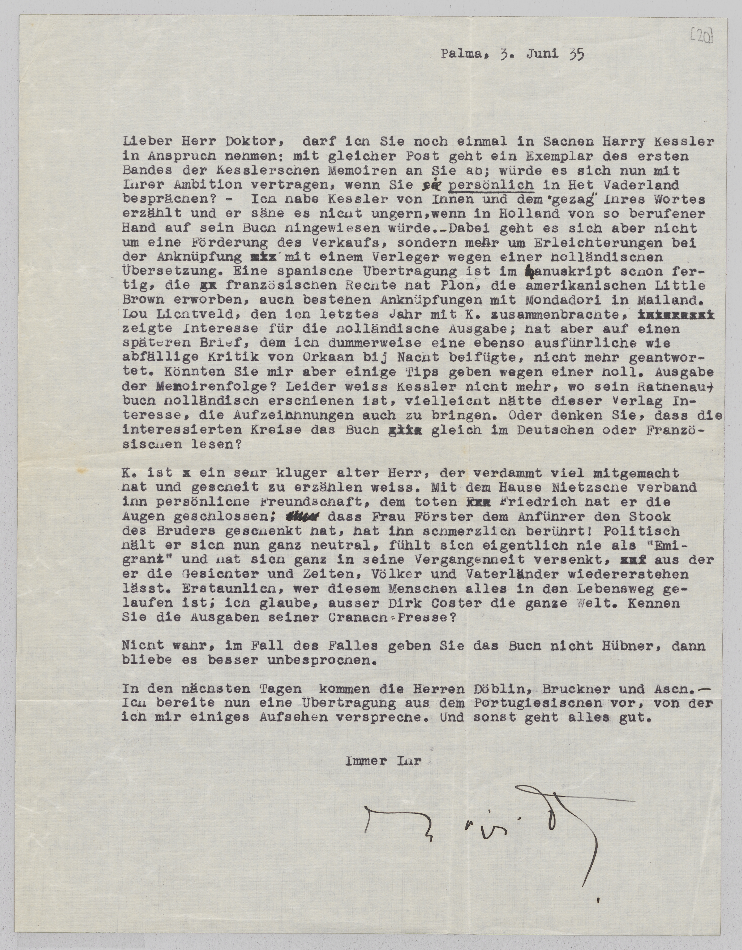 Lieber Herr Doktor, darf ich Sie noch einmal in Sachen Harry Kessler in Anspruch nehmen: mit gleicher Post geht ein Exemplar des ersten Bandes der Kesslerschen Memoiren an Sie ab; würde es sich nun mit Ihrer Ambition vertragen, wenn Sie sie persönlich in Het Vaderland besprächen? - Ich habe Kessler von Ihnen und dem ‘gezag’ Ihres Wortes erzählt und er sähe es nicht ungern, wenn in Holland von so berufener Hand auf sein Buch hingewiesen würde.- Dabei geht es sich aber nicht um eine Förderung des Verkaufs, sondern mehr um Erleichterungen bei der Anknüpfung mit einem Verleger wegen einer holländischen Übersetzung. Eine spanische Ubertragung ist im Manuskript schon fertig, die franzözischen Rechte hat Plon, die amerikanischen Little Brown erworben, auch bestehen Anknüpfungen mit Mondadori in Mailand. Lou Lichtveld, den ich letztes Jahr mit K. zusammenbrachte, zeigte Interesse für die holländische Ausgabe; hat aber auf einen späteren Brief, dem ich dummerweise eine ebenso ausführliche wie abfällige Kritik von Orkaan bij Nacht beifügte, nicht mehr geantwortet. Könnten Sie mir aber einige Tips geben wegen einer holl. Ausgabe der Memoirenfolge? Leider weiss Kessler nicht mehr, wo sein Rathenaubuch holländisch erschienen ist, vielleicht hätte dieser verlag Interesse, die Aufzeichnungen auch zu bringen. Oder denken Sie, dass die interessierten Kreise das Buch gleich im Deutschen oder Französischen lesen?