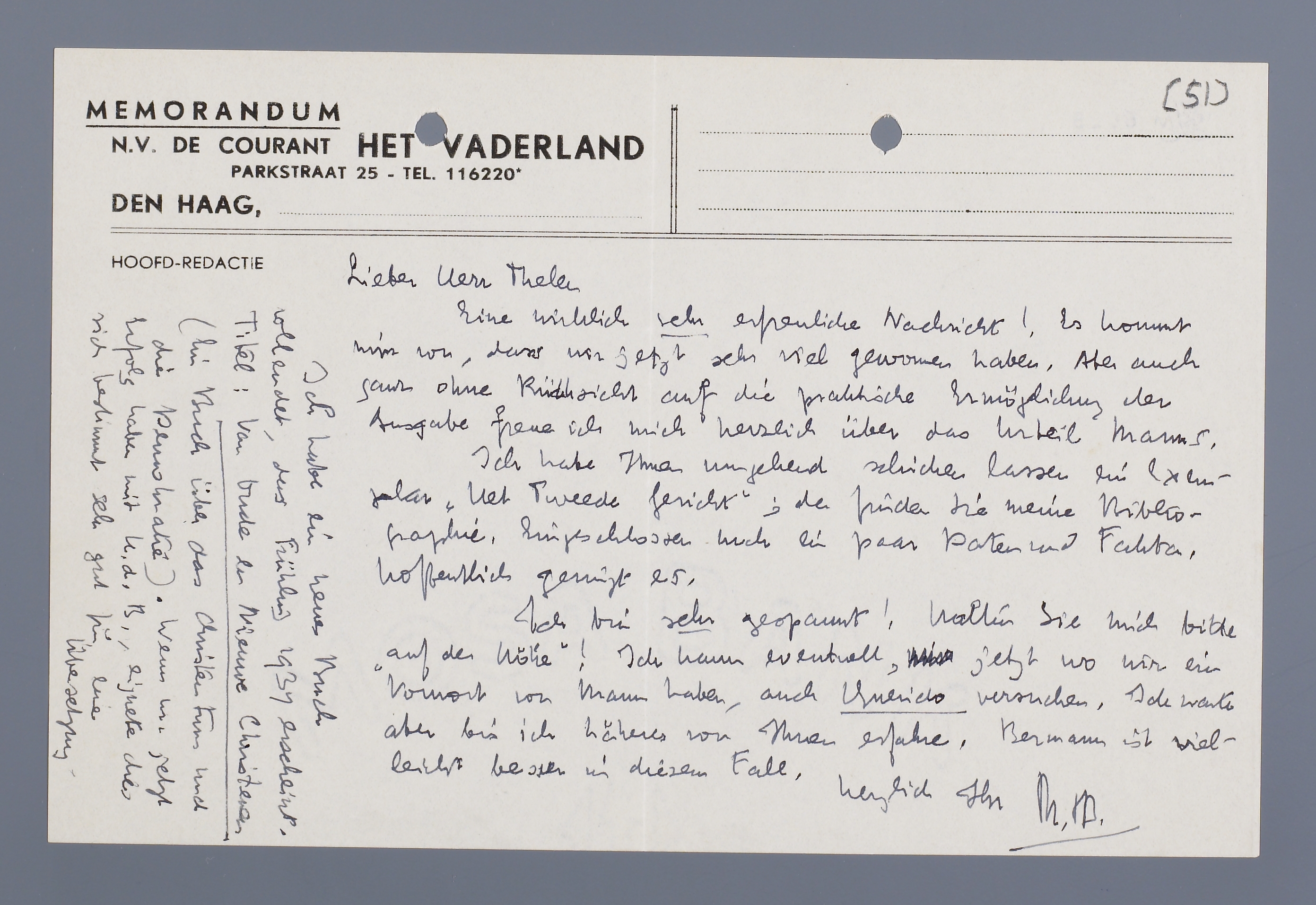 Ich habe ein neus Buch vollendet, das Frühling 1937 erscheint. Titel: Van Oude en Nieuwe Christenen (Ein Buch über das Christentums und die Demokratie). Wenn wir jetzt Erfolg haben mit K.d.B., eignete dies sich bestimmt sehr gut für eine übersetzung.