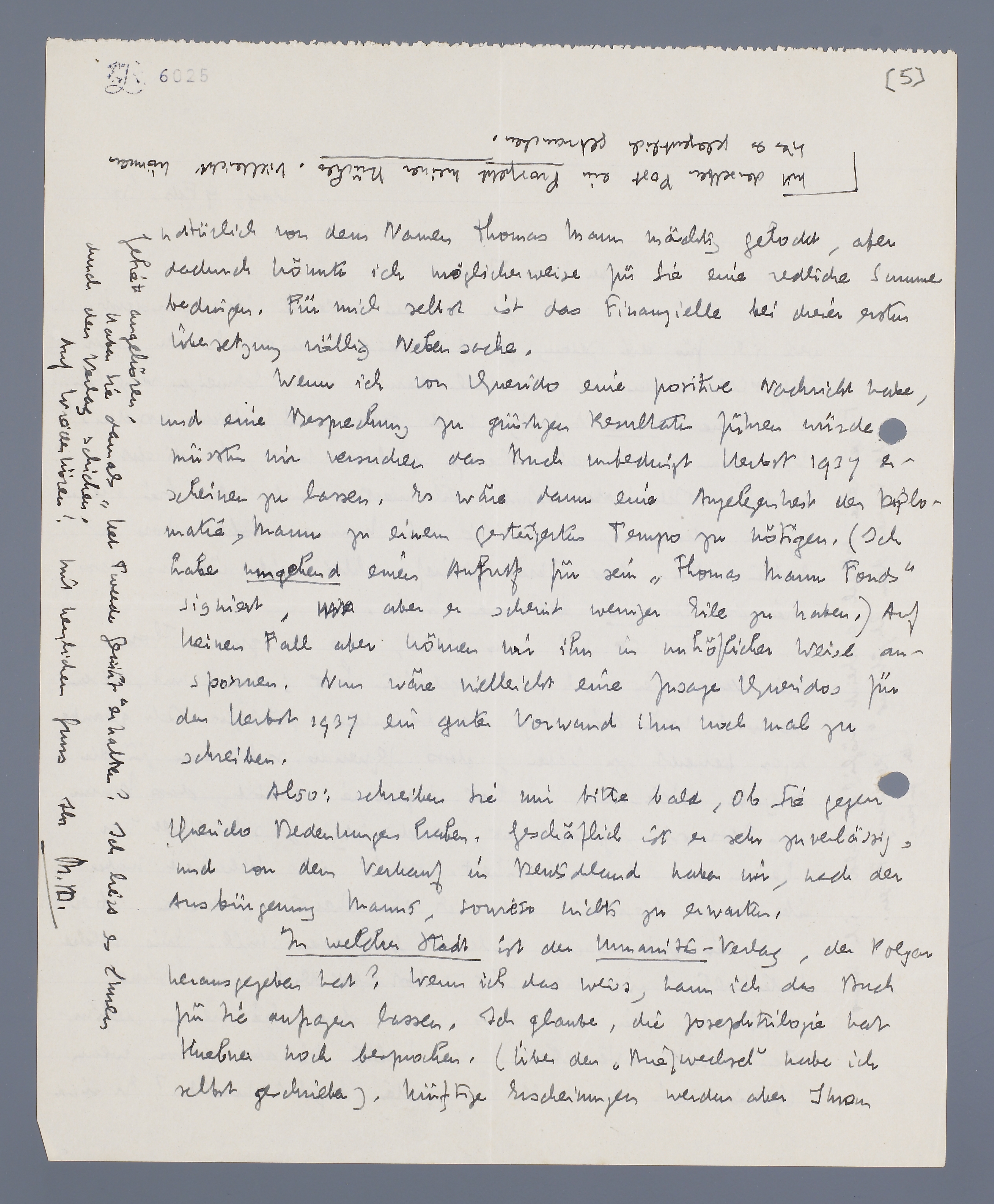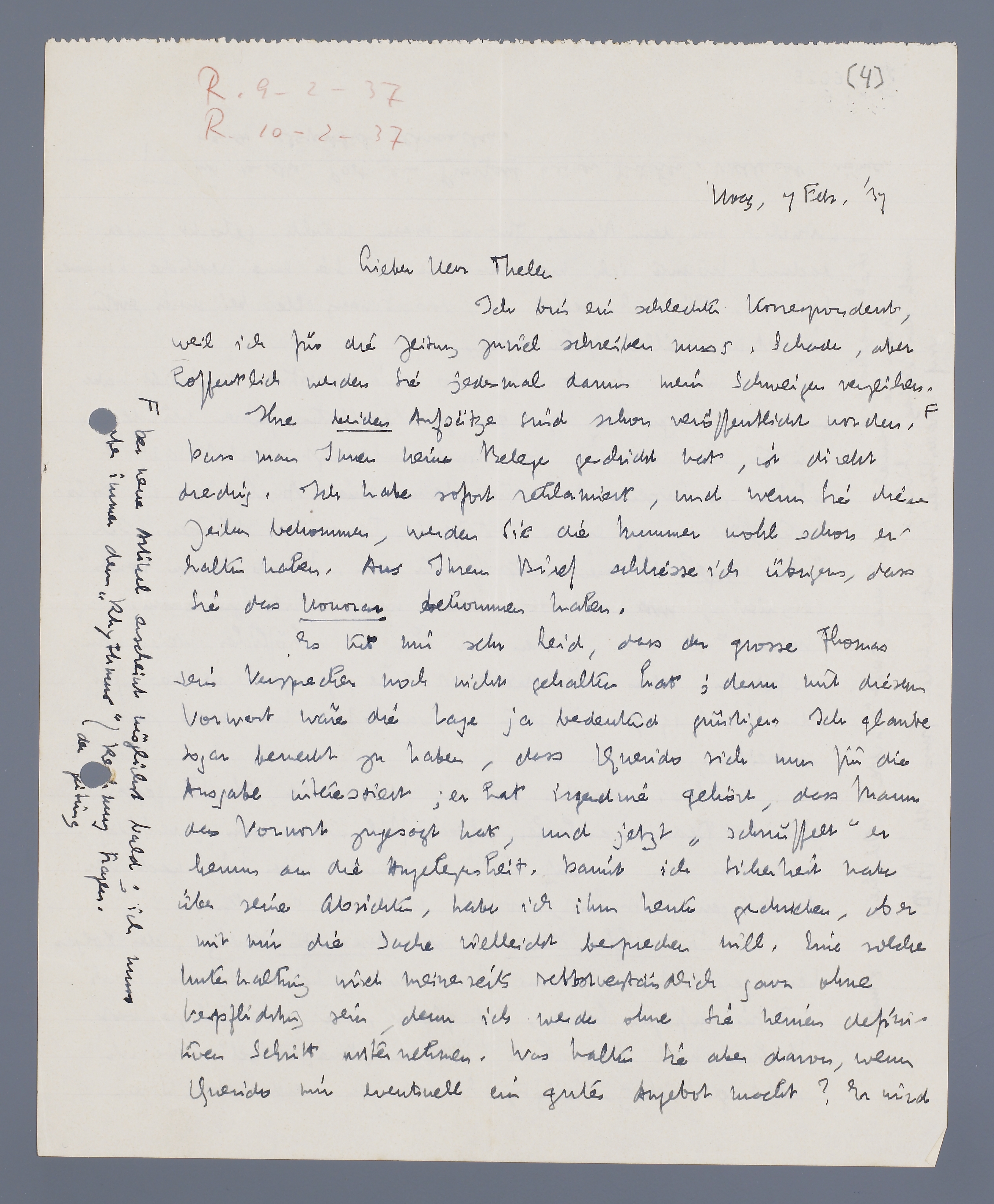 Wenn ich von Querido eine positive Nachricht habe, und eine Besprechung zu günstigen Resultaten führen würde, müssten wir versuchen das Buch unbedingt Herbst 1937 erscheinen zu lassen. Es wäre dann eine Angelegenheit der Diplomatie, Mann zu einem gesteigerten Tempo zu nötigen. (Ich habe umgehend einen Aufruf für sein ‘Thomas Mann Fonds’ signiert, aber er scheint weniger Eile zu haben.) Auf keinen Fall aber können wir ihn in unhöflicher Weise anspornen. Nun wäre vielleicht eine Zusage Querido für den Herbst 1937 ein guter Vorwand ihm noch mal zu schreiben.