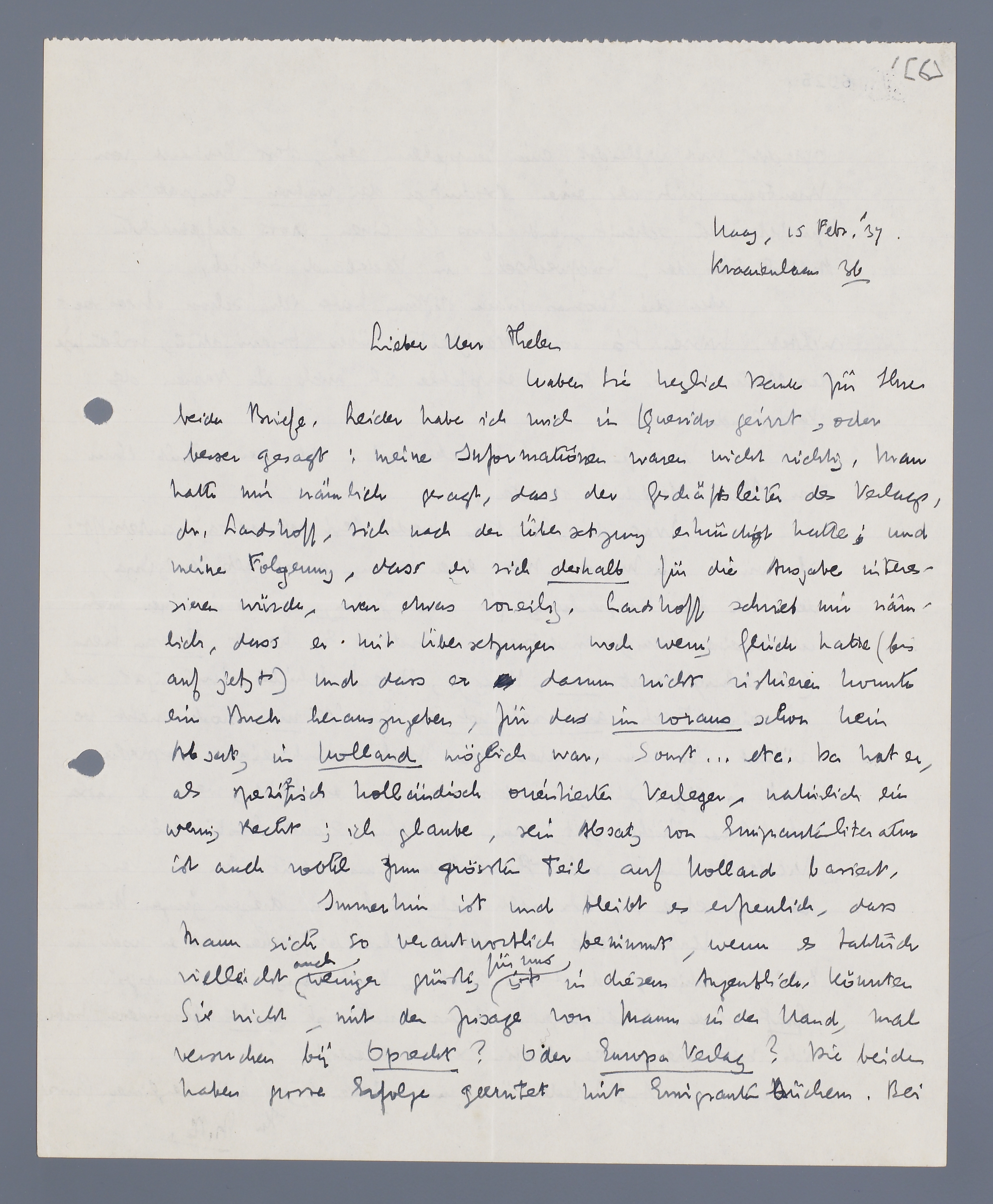 Haben Sie herzlich Dank für Ihre beiden Briefe. Leider habe ich mich in Querido geirrt, oder besser gesagt: meine Informationen waren nicht richtig. Man hatte mir nämlich gesagt, dass der Geschäftsleiter des Verlags, dr. Landshoff, sich nach der Übersetzung erkündigt hatte; und meine Folgerung, dass er sich deshalb für die Ausgabe interessieren würde, war etwas voreilig. Landshoff schrieb mir nämlich, dass er mit Übersetzungen noch wenig Glück hatte (bis auf jetzt) und dass er darum nicht riskieren konnte ein Buch herauszugeben, für das im voraus schon kein Absatz, in Holland möglich war. Sonst... etc. da hat er, als spezifisch holländisch orientierter Verleger, natürlich ein ein wenig Recht; ich glaube, sein Absatz von Emigranterliteratur ist auch wohl zum grössten Teil auf Holland basiert.