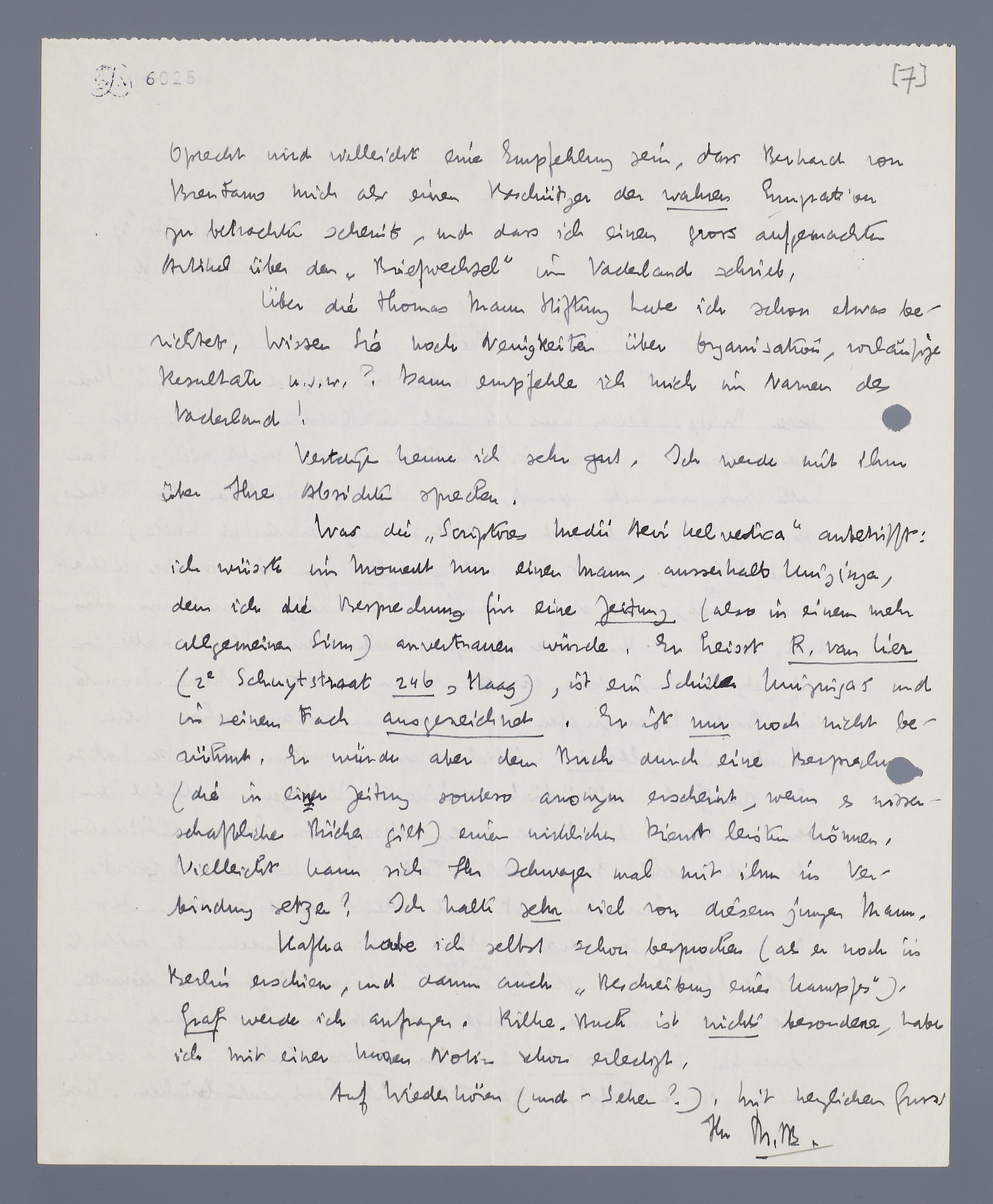 Immerhin ist und bleibt es erfreulich, dass Mann sich so verantwortlich benimmt, wenn es taktisch vielleicht auch weniger günstig für uns ist in diesen Augenblick. Köntten Sie nicht, mit der Zusage von Mann in der Hand, mal versuchen bij Oprecht? Oder Europa Verlag? Die beiden haben grosse Erfolge geerntet mit Emigrantbüchern. Bei Oprecht wird vielleicht eine Empfehlung sein, dass Bernhard von Brentano mich als einen Beschützer der wahren Emigration zu betrachten scheint, und dass ich einen gross aufgemachter Artikel über den ‘Briefwechsel’ im Vaderland schrieb.