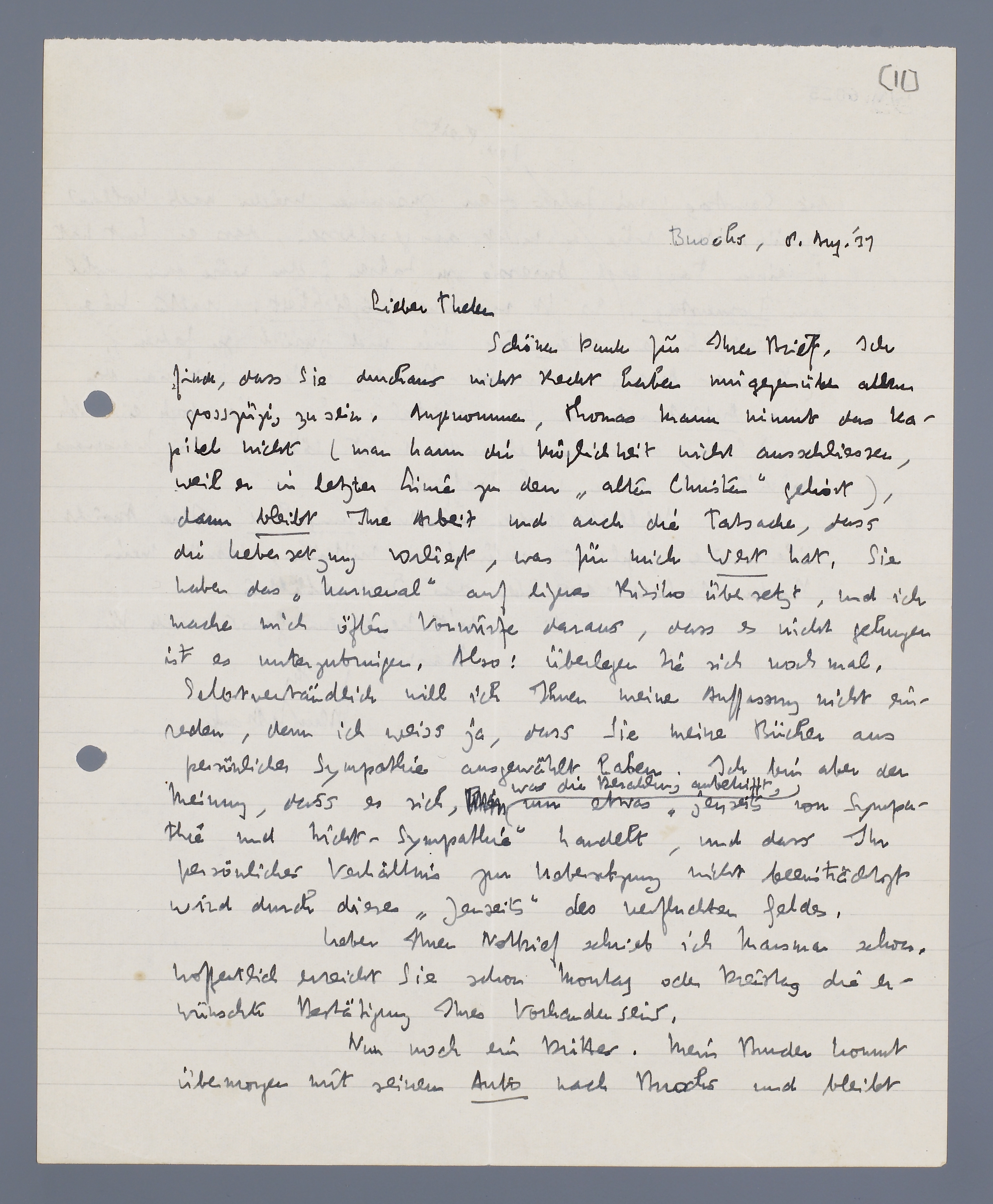 Schönen Dank für Ihnen Brief. Ich finde dass Sie durchaus nicht Recht haben mir gegenüber allzu grosszügig zu sein. Angenommen, Thomas Mann nimmt das Kapitel nicht (man kann die Möglichkeit nicht ausschliessen, weil er in letzter Linie zu den ‘alten Christen’ gehört), dann bleibt Ihre Arbeit und auch die Tatsache, dass die Uebersetzung vorliegt, was für mich Wert hat. Sie haben das ‘Karneval’ auf eigenes Risiko übersetzt, und ich mache mich öften Vorwürfe daraus, dass es nicht gelungen ist es unterzubringen. Also: überlegen Sie sich noch mal. Selbstverständlich will ich Ihnen meine Auffassung nicht einreden, denn ich weiss ja, dass Sie meine Bücher aus persönlicher Sympathie ausgewählt haben. Ich bin aber der Meinung, dass es sich, was die Bezahlung anbetrifft, um etwas ‘jenseits’ von Sympathie und nicht ‘Sympathie’ handelt, und dass Ihr persönliches Verhältnis zur Uebersetzung nicht beeinträchtigt wird durch dieses ‘Jenseits’ des verfluchten Geldes.