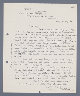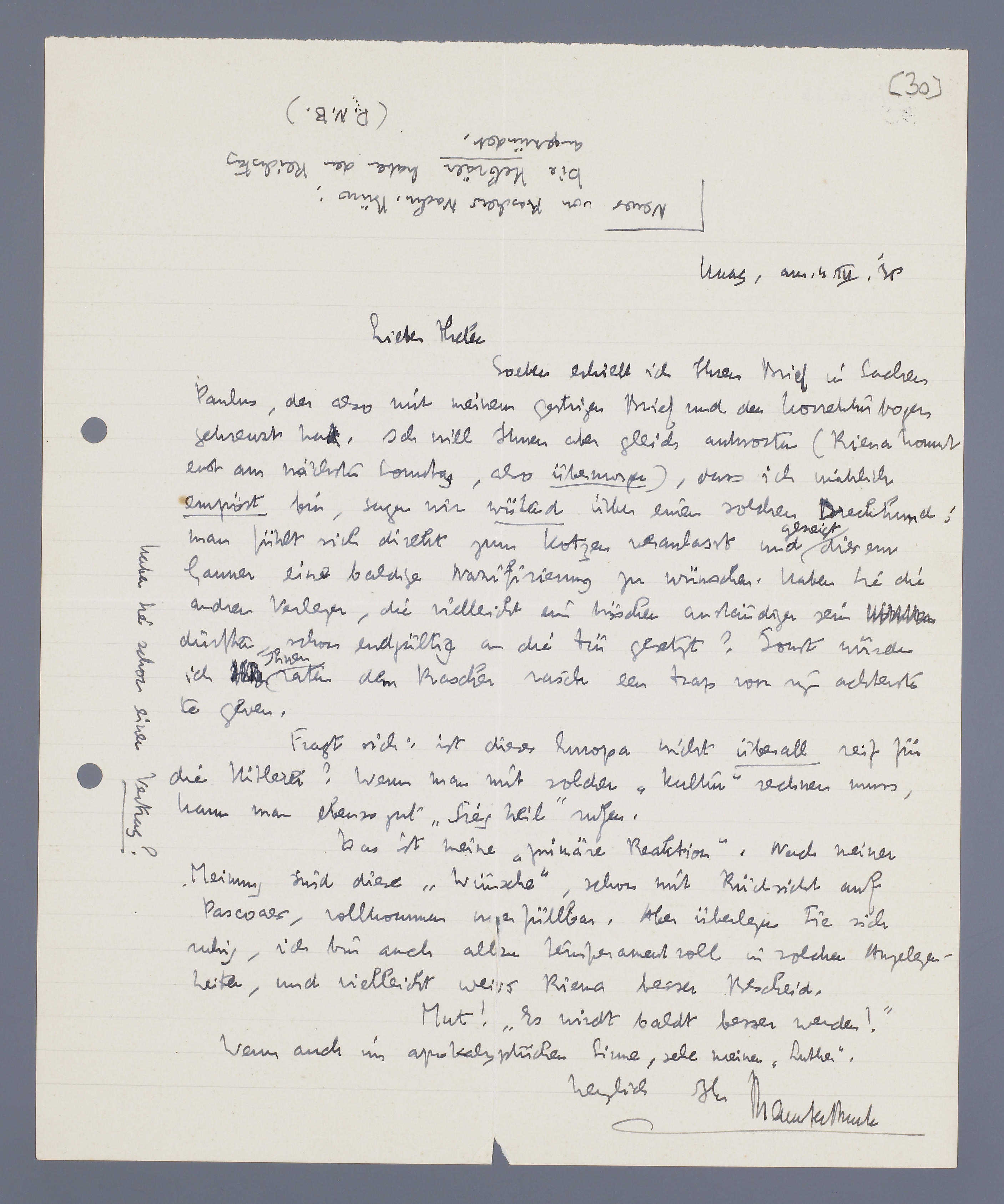 Soeben erhielt ich Ihren Brief in Sachen Paulus, der also mit meinem gestrigen Brief und den Korrekturbogen gekreuzt hat. Ich will Ihnen aber gleich antworten (Riena kommt erst am nächsten Sonntag, also übermorgen), dass ich wahrlich empört bin, sagen wir wütend über einen solchen Dreckhund; man fühlt sich direkt zum kotzen veranlasst und geneigt diesem Gauner eine baldige nazifizierung zu wünschen. [xxxx] Sie die andren Verleger, die vielleicht ein bisschen anständiger sein dürffen schon [xx] an die Tür gesetzt? Sonzt würde ich Ihnen raten dem Rascher rasch een trap voor zijn achterste te geven.