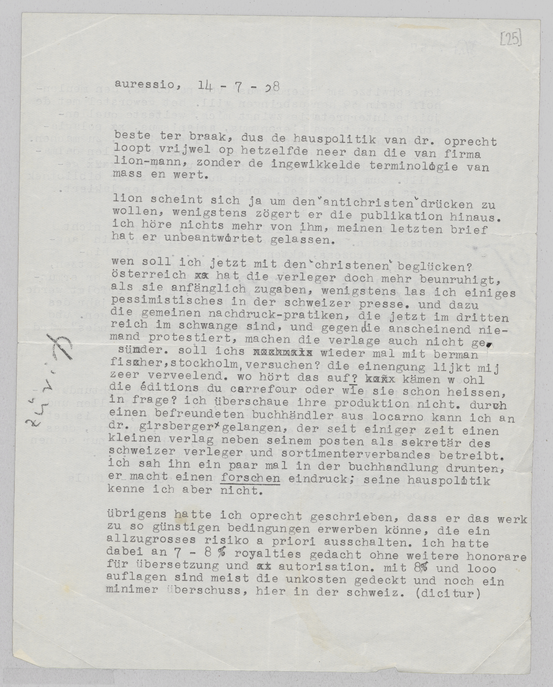 österreich hat die verleger doch mehr beunruhigt, als sie anfänglich zugaben, wenigstens las ich einiges pessimistisches in der schweizer presse. und dazu die gemeinen nachdruck-pratiken, die jetzt im dritten reich im schwange sind, und gegen die anscheinend niemand protestiert, machen die verlage auch nicht gesünder. soll ichs wieder mal mit berman fisher, stockholm, versuchen? die einengung lijkt mij zeer verveelend. wo hört das auf? kämen wohl die éditions du carrefour oder wie sie schon heissen, in frage? ich überschaue ihre produktion nicht. durch einen befreundeten buchhändler aus locarno kann ich an dr. girsberger gelangen, der seit einiger zeit einen kleinen verlag neben seinem posten als sekretär des schweizer verleger und sortimenterverbandes betreibt. ich sah ihn ein paar mal in der buchhandlung drunten, er macht einen forschen eindruck; seine hauspolitik kenne ich aber nicht.