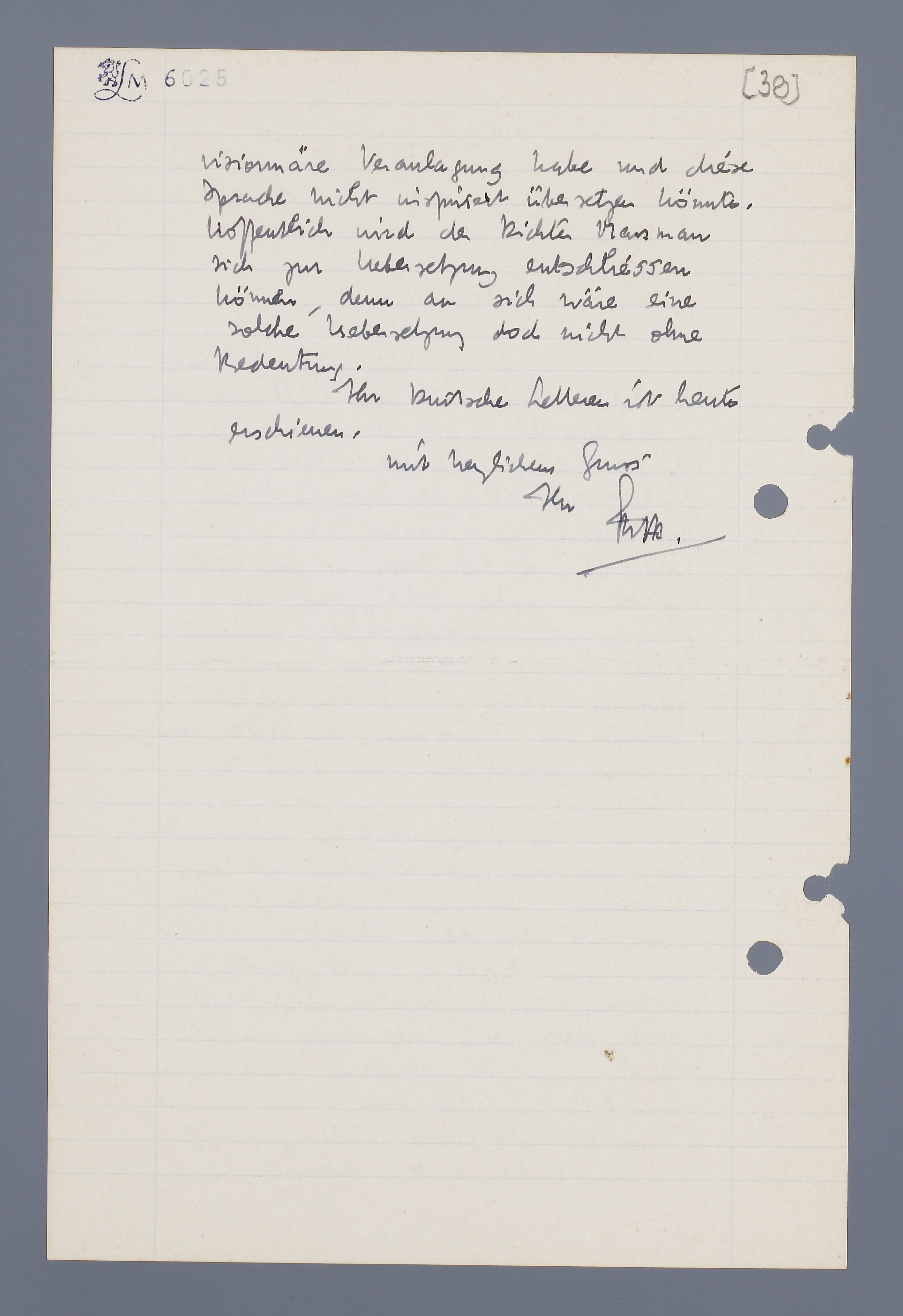 Für Henny herziche Grüsse. Ich habe, wie Sie und er sehen werden, ihn wegen ‘Chantage’ verklagt; die Sache ist aber bloss theoretisch, also nur keine Angst! -Was ‘Zarathustra’ anbetrifft: Von Suchtelen hat mich erst gebeten die Uebersetzung zu vollenden, was ich abgelehnt habe. Erstens aus Gründen, die auch Henny anführt, zweitens uns einem Motiv, das für Henny nicht gilt: dass ich keine visionäre Veranlagung habe und diese Sprache nicht inspiriert übersetzen könnte. Hoffentlich wird der Dichter Marsman sich zur Uebersetzung entschliessen können, denn an sich wäre eine solche [ebensetzung] doch nicht ohne Bedeutung.
