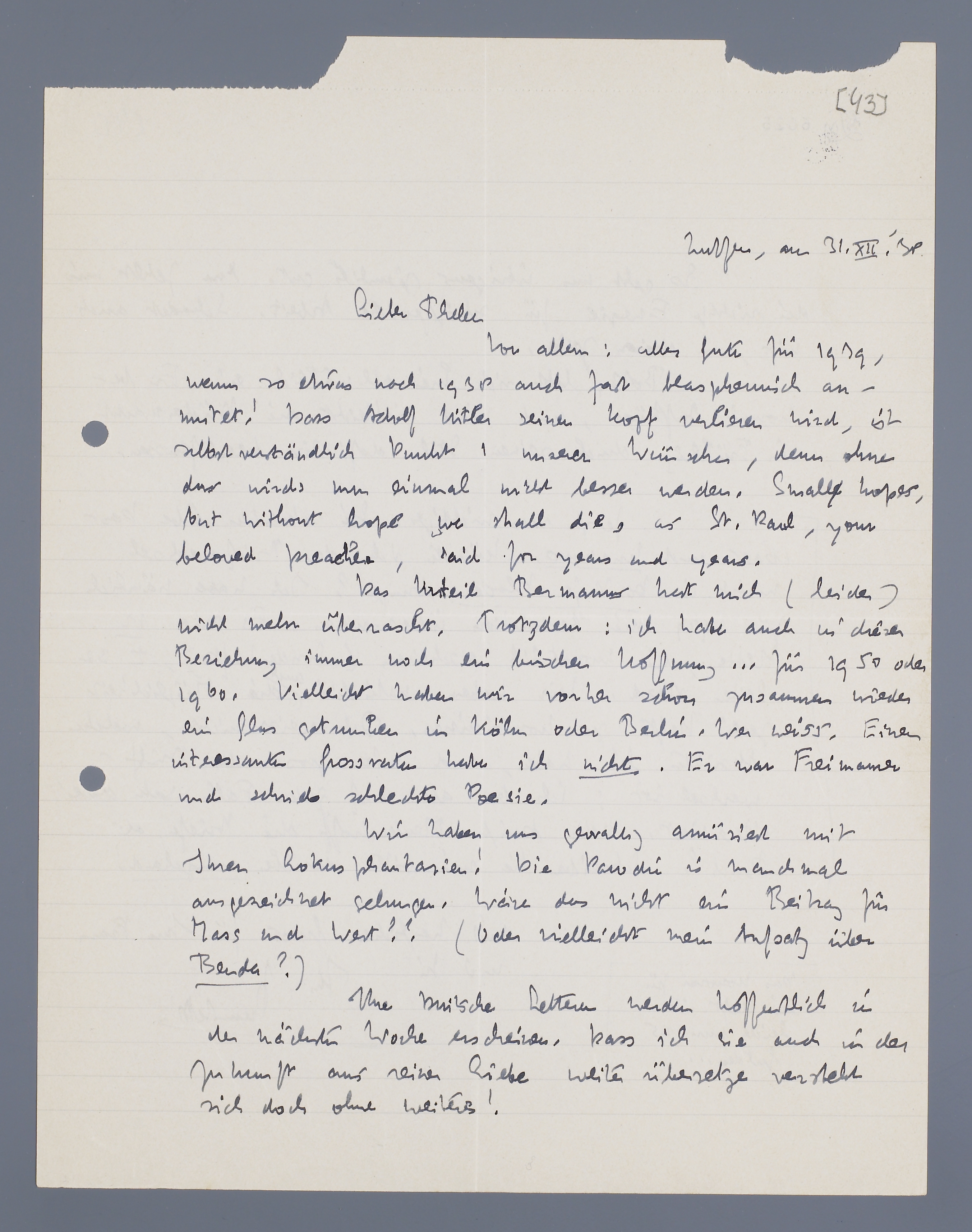 Vor allen: alles gute für 1939, wann so etwas noch 1938 auch [fxx] blasphemisch anmutet! Dass Adolf Hitler seinen kopf verlieren wird, ist selbstverständlich Punkt 1 unserer Wünschen, denn ohne das wird's nun einmal nicht besser werden. Small hopes, but without hope we shall die, as St. Paul, your beloved preacher, said for years and years.