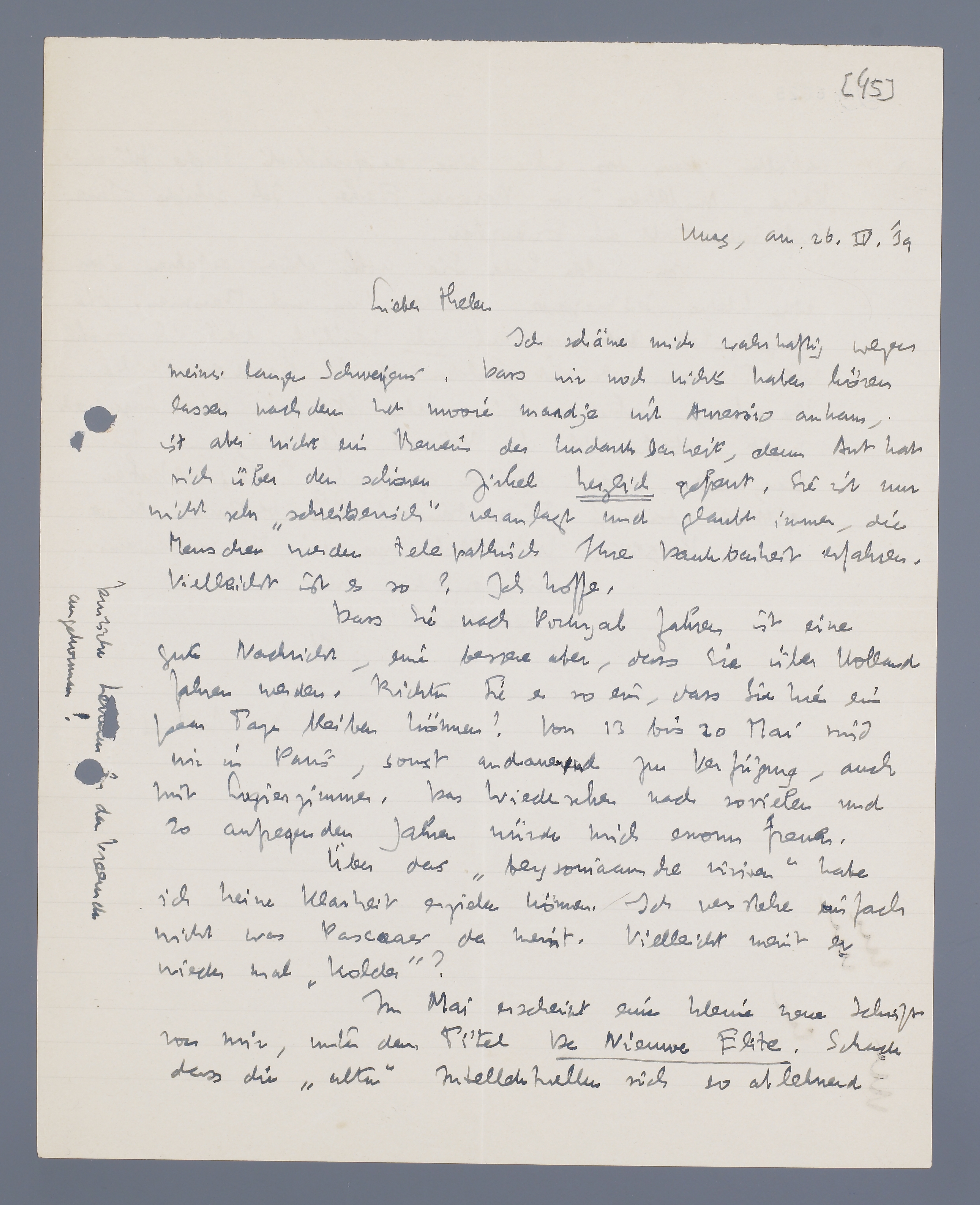 Im Mai erscheint eine kleine neue Schrift von mir, unter dem Titel De Nieuwe Elite. Schade dass die ‘alten’ Intellektuellen sich so ablehnend verhalten, denn das wäre eine ausgezeichnete Sache für die Reihe ‘Ausblicke’ von Bermannn Fischer. Ich schicke Ihnen auf jeden Fall ein Exemplar.