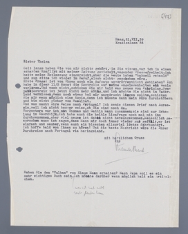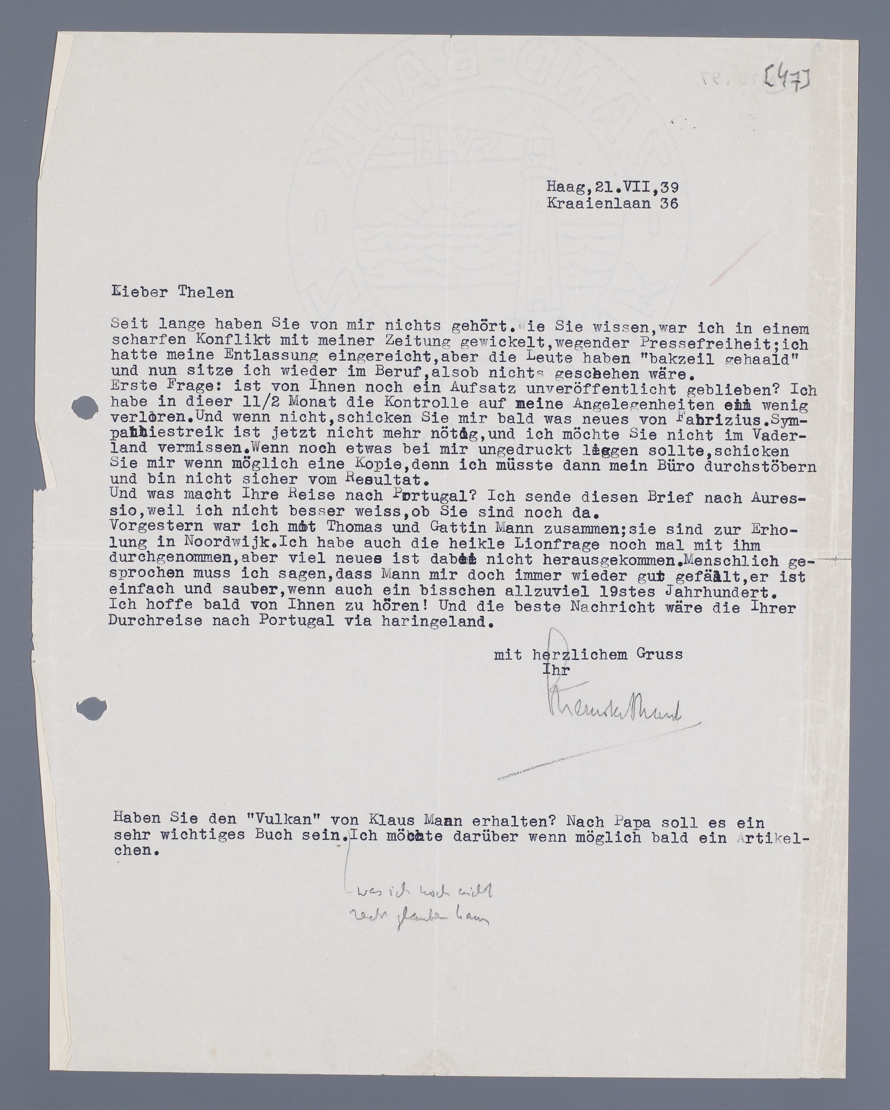 Vorgestern war ich mit Thomas und Gattin Mann zusammen; sie sind zur Erholung in Noordwijk. Ich habe auch die heikle Lion-frage noch mal mit ihm durchgenommen, aber viel neues ist dabei nicht herausgekommen. Menschlich gesprochen muss ich sagen, dass Mann mir doch immer wieder gut gefällt, er ist einfach und sauber, wenn auch ein bisschen alzuviel 19stes Jahrhundert.