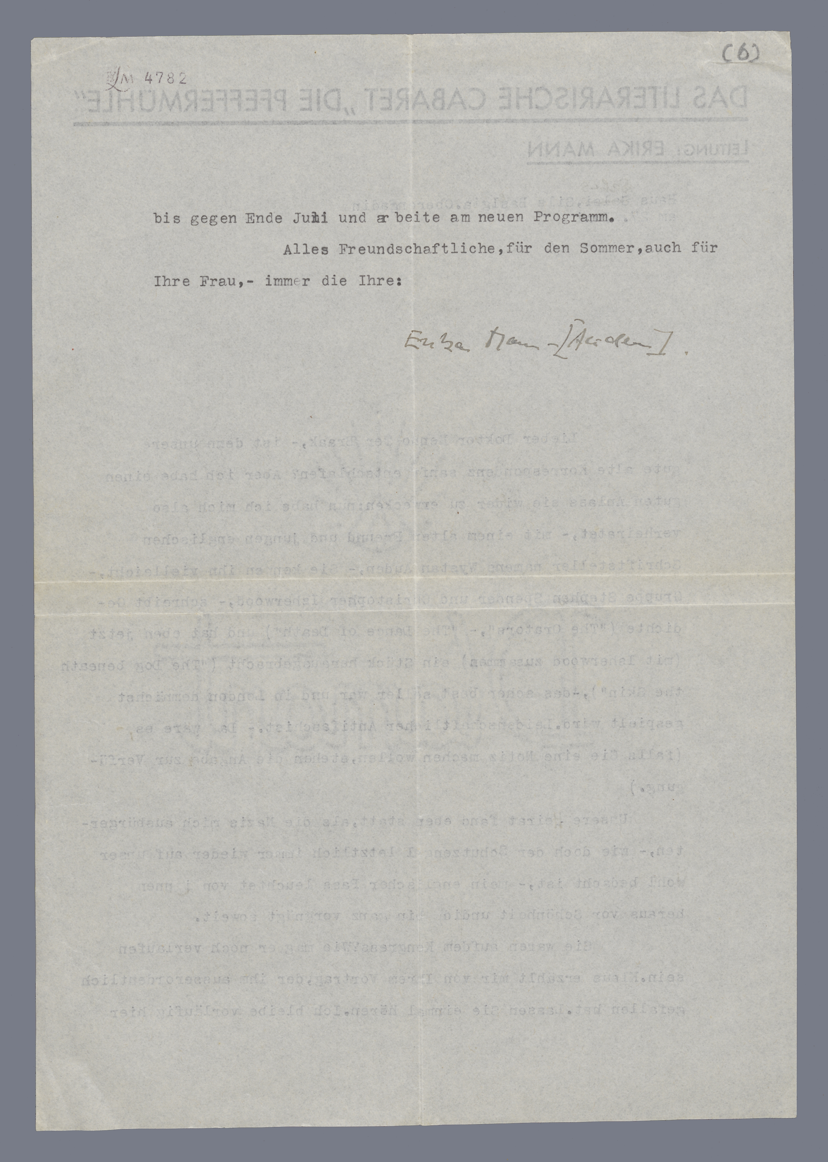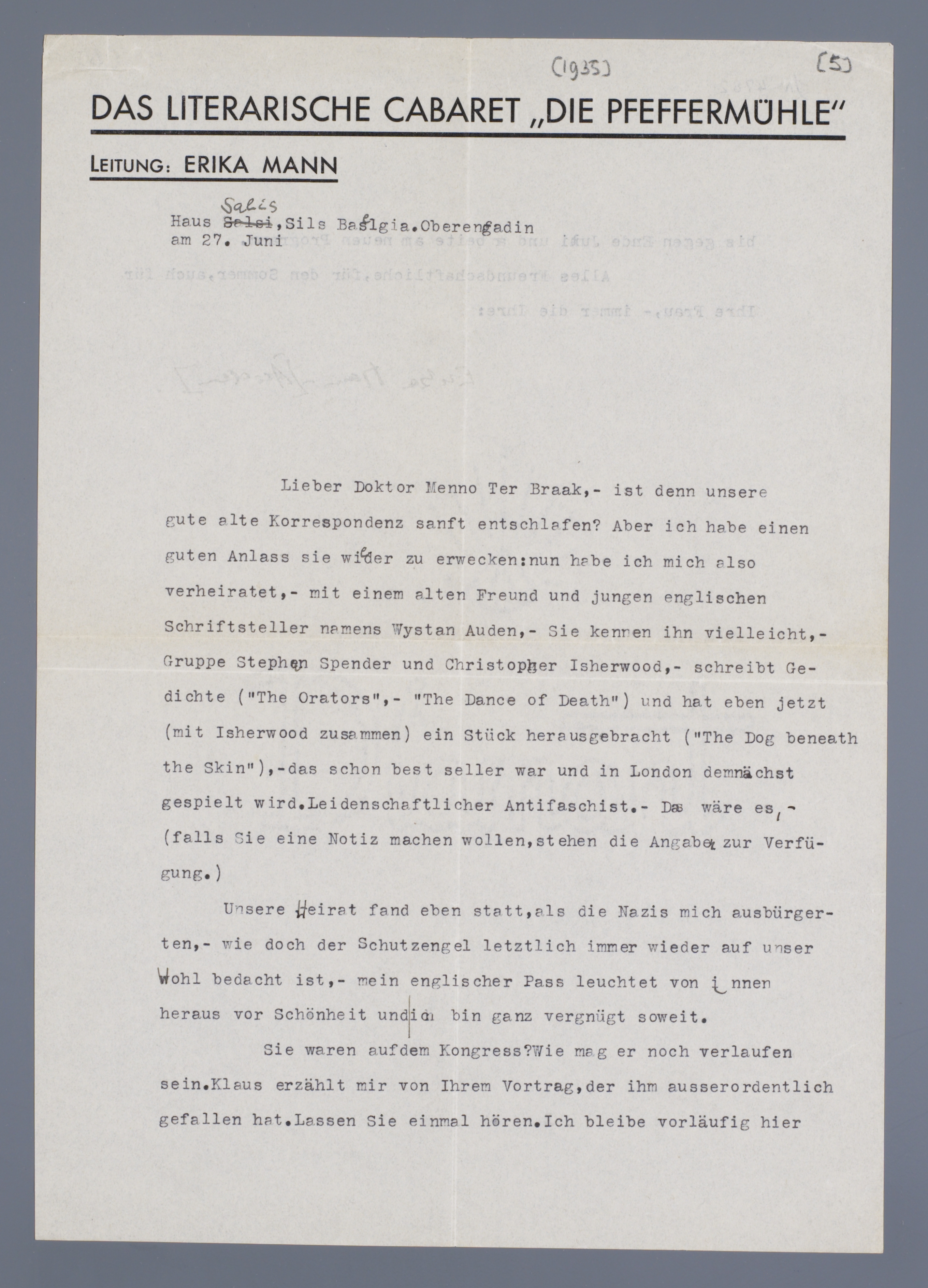 Lieber Doktor Menno Ter Braak,- ist denn unsere gute alte Korrespondenz sanft entschlafen? Aber ich habe einen guten Anlass sie wieder zu erwecken: nun habe ich mich also verheiratet,- mit einem alten Freund und jungen englischen Schriftsteller namens Wystan Auden,- Sie kennen ihn vielleicht,- Gruppe Stephen Spender und Christopher Isherwood,- schreibt Gedichte (‘The Orators’,- ‘The Dance of Death’) und hat eben jetzt (mit Isherwood zusammen) ein Stück herausgebracht (‘The Dog beneath the Skin’),- das schon best seller war und in London demnächst gespielt wird. Leidenschaftlicher Antifaschist.- Das wäre es,- (falls Sie eine Notiz machen wollen, stehen die Angaben zur Verfügung.)