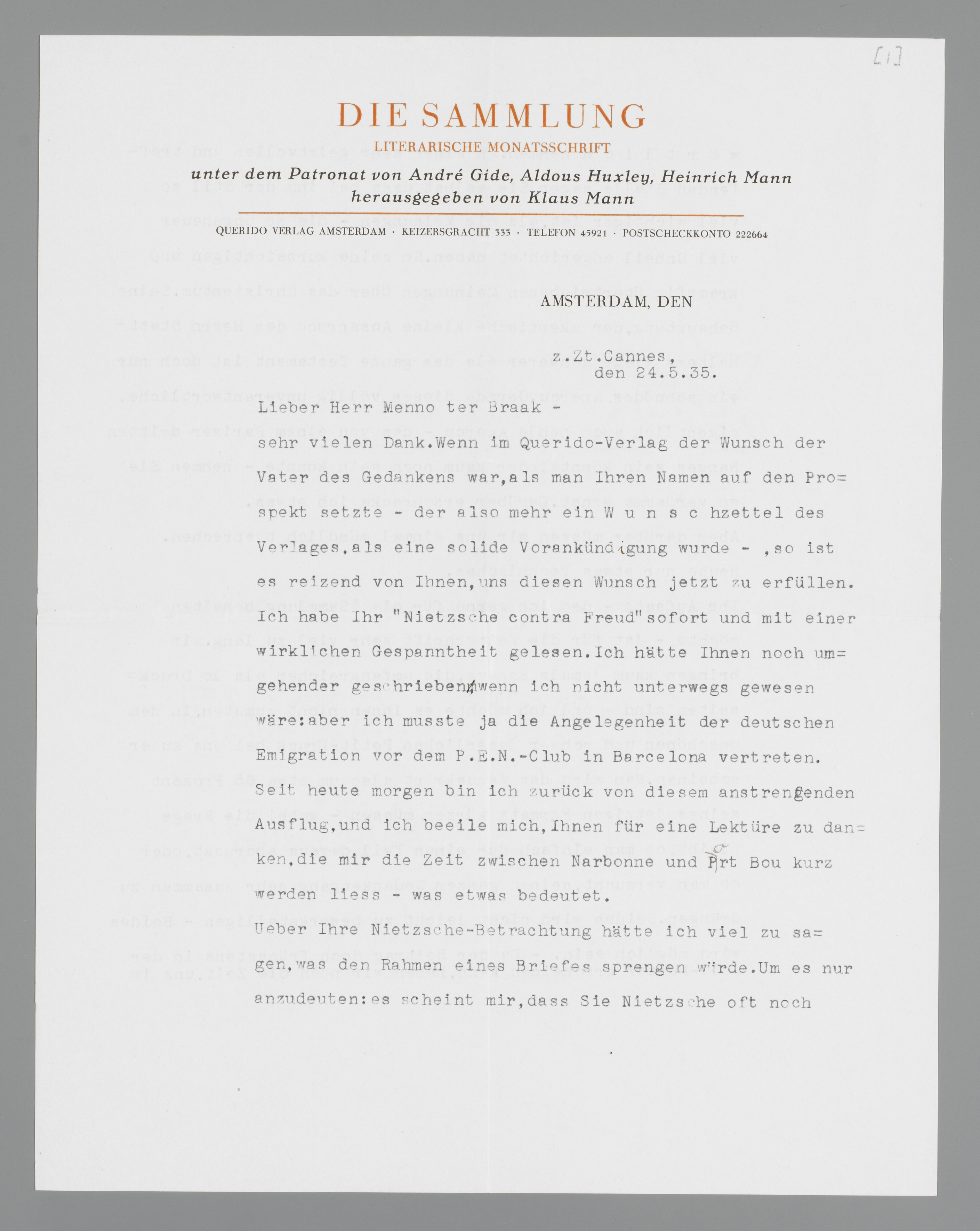 sehr vielen Dank. Wenn im Querido-Verlag der Wunsch der Vater des Gedankes war, als man Ihren Namen auf den Prospekt setzte - der also mehr ein Wunschzettel des Verlages, als eine solide Vorankündigung wurde - , so ist es reizend von Ihnen, uns diesen Wunsch jetzt zu erfüllen. Ich habe Ihr ‘Nietzsche contra Freud’ sofort und mit einer wirklichen Gespanntheit gelesen. Ich hätte Ihnen noch umgehender geschrieben wenn ich nicht unterwegs gewesen wäre; aber ich musste ja die Angelegenheit der deutschen Emigration vor dem P.E.N.-Club in Barcelona vertreten. Seit heute morgen bin ich zurück von diesem anstrengenden Ausflug, und ich beeile mich, Ihnen für eine Lektüre zu danken, die mir die Zeit zwischen Narbonne und Port Bou kurz werden liess - was etwas bedeutet.