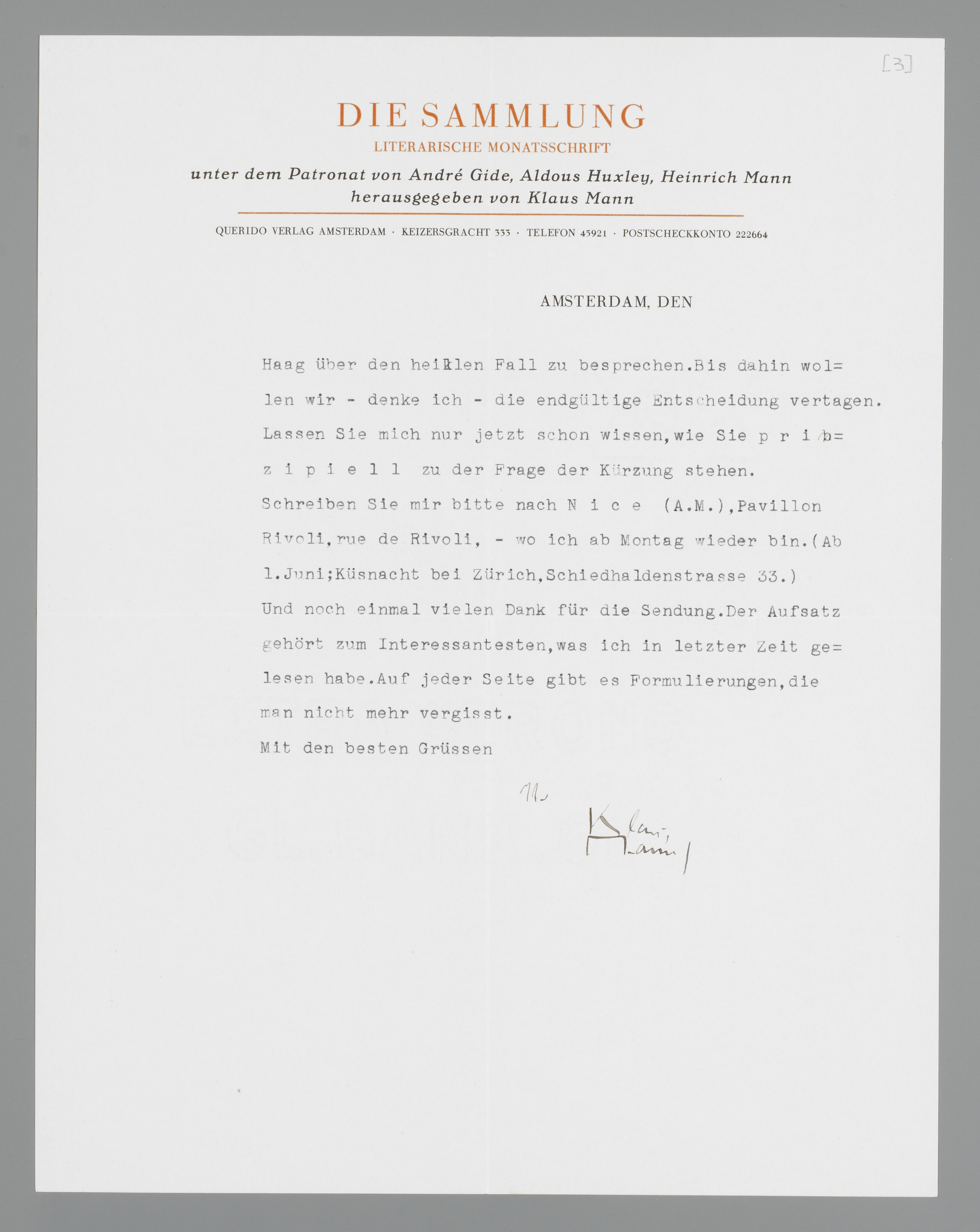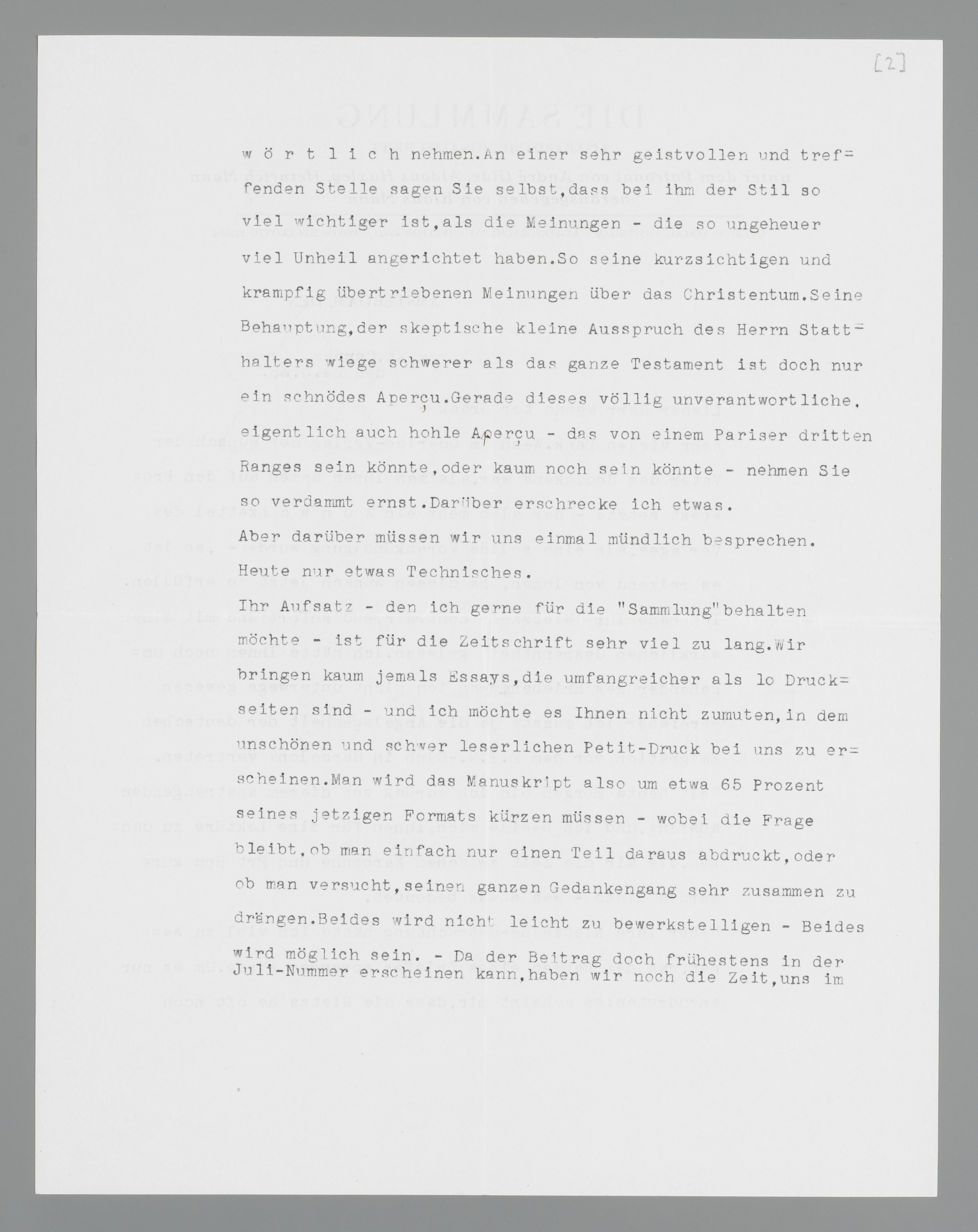 Ihr Aufsatz - den ich gerne für die ‘Sammlung’ behalten möchte - ist für die Zeitschrift sehr viel zu lang. Wir bringen kaum jemals Essays, die umfangreicher als 10 Druckseiten sind - und ich möchte es Ihnen nicht zumuten, in dem unschönen und schwer leserlichen Petit-Druck bei uns zu erscheinen. Man wird das Manuskript also um etwa 65 Prozent seines jetzigen Formats kürzen müssen - wobei die Frage bleibt, ob man einfach nur einen Teil daraus abdruckt, oder ob man versucht, seinen ganzen Gedankengang sehr zusammen zu drängen. Beides wird nicht leicht zu bewerkstelligen - Beides wird möglich sein. - Da der Beitrag doch frühestens in der Juli-Nummer erscheinen kann, haben wir noch die Zeit, uns im Haag über den heiklen Fall zu besprechen. Bis dahin wollen wir -denke ich - die endgültige Entscheidung vertragen. Lassen Sie mich nur jetzt schon wissen, wie Sie prinzipiell zu der Frage der Kürzung stehen.