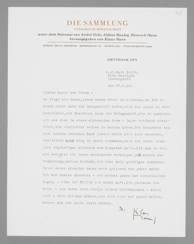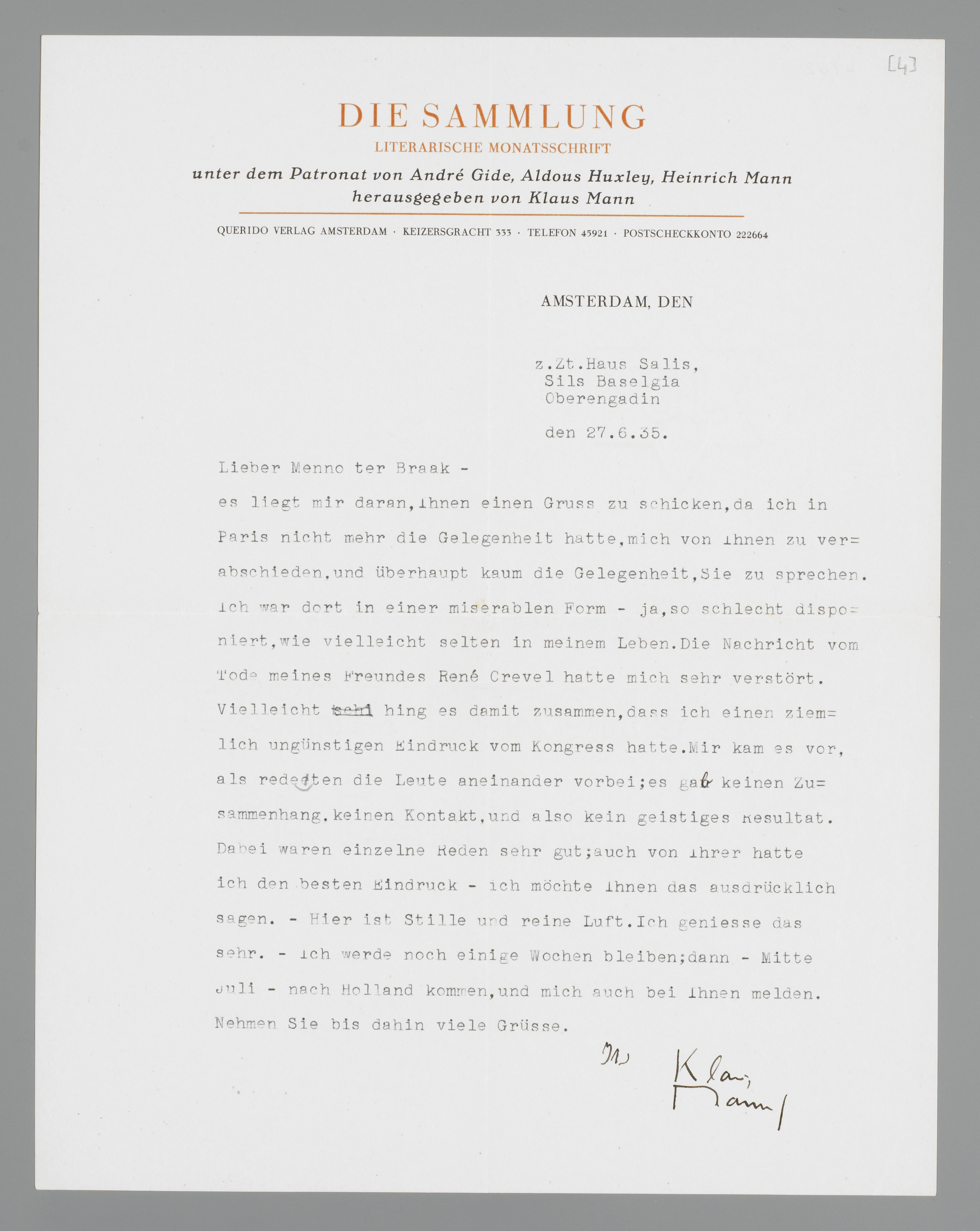 es liegt mir daran, Ihnen einen Gruss zu schicken, da ich in Paris nicht mehr die Gelegenheit hatte, mich von Ihnen zu verabschieden, und überhaupt kaum die Gelegenheit, Sie zu sprechen. Ich war dort in einer miserablen Form - ja, so schlecht disponiert, wie vielleicht selten in meinem Leben. Die Nachricht vom Tode meines Freundes René Crevel hatte mich sehr verstört. Vielleicht hing es damit zusammen, dass ich einen ziemlich ungünstigen Eindruck vom Kongress hatte. Mir kam es vor, als redeten die Leute aneinander vorbei; es gab keinen Zusammenhang, keinen Kontakt, und also kein geistiges Resultat. Dabei waren einzelne Reden sehr gut; auch von Ihrer hatte ich den besten Eindruck - ich möchte Ihnen das ausdrücklich sagen. - Hier ist Stille und reine Luft. Ich geniesse das sehr. - Ich werde noch einige Wochen bleiben; dann - Mitte Juli - nach Holland kommen, und mich auch bei Ihnen melden. Nehmen Sie bis dahin viele Grüsse.