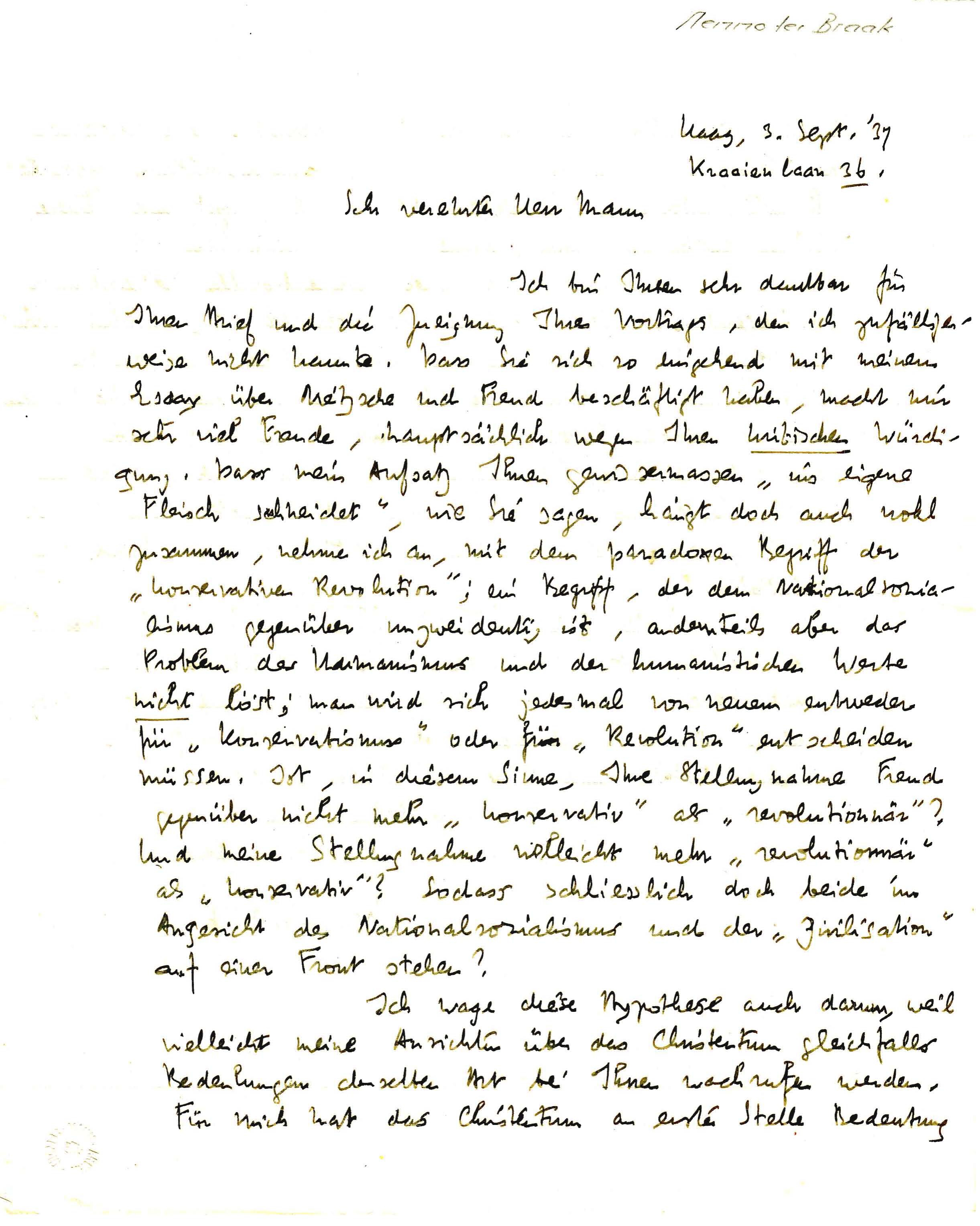 Ich bin Ihnen sehr dankbar für Ihren Brief und die Zueignung Ihres Vortrags, den ich zufälligerweise nicht kannte. Dass Sie sich so eingehend mit meinem Essay über Nietzsche und Freud beschäftigt haben, macht mir sehr viel Freude, hauptsächlich wegen Ihren kritischen Würdigung. Dass mein Aufsatz Ihnen gewissermassen ‘ins eigene Fleisch schneidet’, wie Sie sagen, hängt doch auch wohl zusammen, nehme ich an, mit dem paradoxen Begriff der ‘konservativen Revolution’; ein Begriff, der dem Nationalsozialismus gegenüber unzweideutig ist, andernteils aber das Problem des Humanismus und der humanistischen Werte nicht löst; man wird sich jedesmal von neuem entweder für ‘Konservatismus’ oder für ‘Revolution’ entscheiden müssen. Ist, in diesem Sinne, Ihre Stellungnahme Freud gegenüber nicht mehr ‘konservativ’ als ‘revolutionär’? Und meine Stellungnahme vielleicht mehr ‘revolutionär’ als ‘konservativ’? Sodass schliesslich doch beide im Angesicht des Nationalsozialismus und der ‘Zivilisation’ auf einer Front stehen?