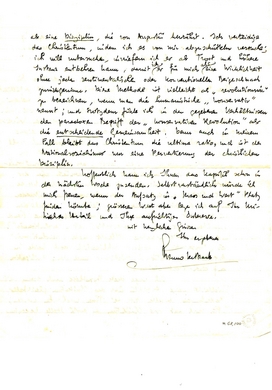 Ich wage diese Hypothese auch darum, weil vielleicht meine Ansichten über das Christentum gleichfalls Bedeutungen derselben Art bei Ihnen wachrufen werden. Für mich hat das Christentum an erster Stelle Bedeutung als eine Disziplin, die von Augustin herrührt. Ich verteidige das Christentum, indem ich es von mir abzuschütteln versuche; ich will untersuchen, inwiefern ich es als Trost und höhere Instanz entbehren kann, damit ich es für mich als eine Wirklichkeit ohne jeden sentimentalischen oder konventionellen Beigeschmack zurückgewinne. Diese Methode ist vielleicht als ‘revolutionär zu bezeichnen, wenn man die humanistische ‘konservativ’ nennt; und trotzdem führe ich in den gegebenen Verhältnissen den paradoxen Begriff der ‘konservativen Revolution’ als die entscheidende Gemeinsamkeit. Denn auch in meinem Fall bleibt das Christentum die ultimo ratio, und ist der Nationalsozialismus nur eine Pervertierung der christlichen Disziplin.