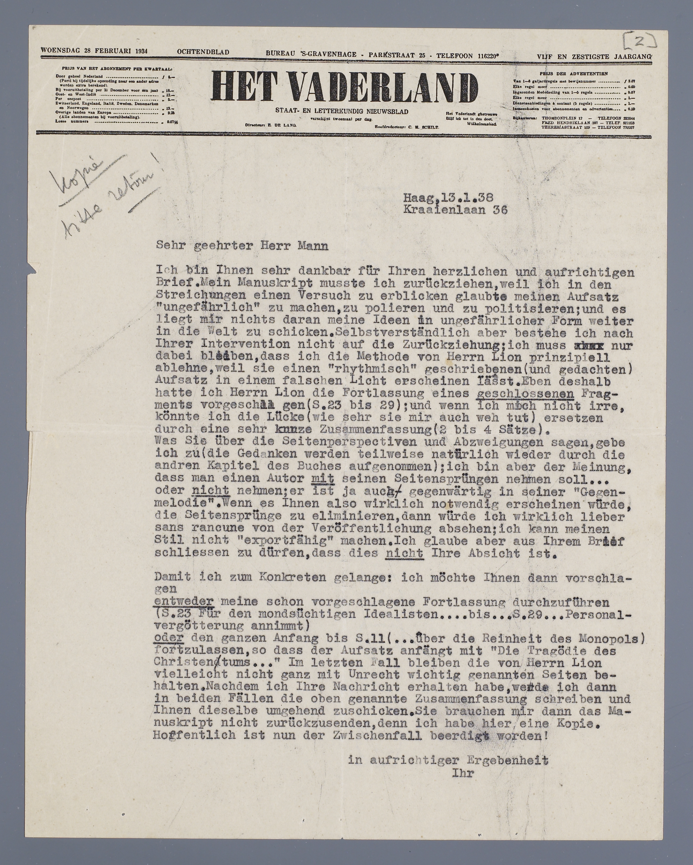 oder den ganzen Anfang bis S.11 (...über die Reinheit des Monopols) fortzulassen, so dass der Aufsatz anfängt mit ‘Die Tragödie des Christentums...’ Im letzten Fall bleiben die von Herrn Lion vielleicht nicht ganz mit Unrecht wichtig genannten Seiten behalten. Nachdem ich Ihre Nachricht erhalten habe, werde ich dann in beiden Fällen die oben genannte Zusammenfassung schreiben und Ihnen dieselbe umgehend zuschicken. Sie brauchen mir dann das Manuskript nicht zurückzusenden, denn ich habe hier eine Kopie. Hoffentlich ist nun der Zwischenfall beerdigt worden!