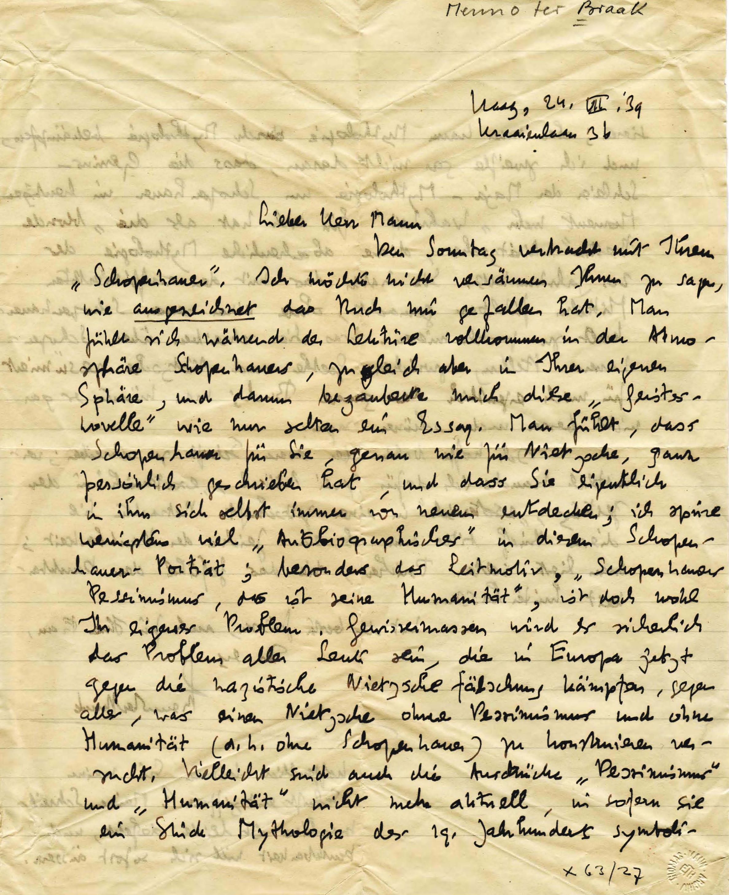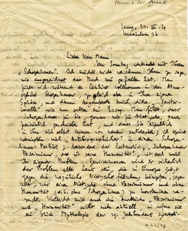 Den Sonntag Verbracht mit Ihrem ‘Schopenhauer’. Ich mochte nicht versäumen Ihnen zu sagen, wie ausgezeichnet das Buch mir gefallen hat. Man fühlt sich während der Lektüre vollkommen in der Atmosphäre Schopenhauers, zugleich aber in Ihrer Eigenen Sphäre, und darum verzauberte mich diese ‘Geistesnovelle’ wie nur selten ein Essay. Man fühlt, dass Schopenhauer für Sie, genau wie für Nietzsche, ganz persönlich geschrieben hat, und dass Sie eigentlich in ihm sich selbst immer von neuem entdecken; ich spüre wenigstens viel ‘Autobiographisches’ in diesem Schopenhauer-Porträt; besonders das Leitmotiv, ‘Schopenhauer Pessimismus, das ist seine Humanität’, ist doch wohl Ihr eigenes Problem. Gewissermassen wird es sicherlich das Problem aller Leute sein, die in Europa jetzt gegen die nazistische Nietzschefälschung kämpfen, gegen alles, was einen Nietzsche ohne Pessimismus und ohne Humanität (d.h. ohne Schopenhauer) zu konstruieren versucht. Vielleicht sind auch die Ausdrücke ‘Pessimismus’ und ‘Humanität’ nicht mehr aktuell, in sofern sie ein Stück Mythologie des 19. Jahrhunderts symbolisieren; aber man kann Mythologie durch Mythologie bekämpfen; und ich zweifle gar nicht daran, dass die Genius-Schleier der Maja-Mythologie um Schopenhauer im heutigen Moment mehr ‘Wahrheit’ für sich hat als die ‘blonde Bestie’ Nietzsches, diese abscheuliche Mythologie des 20. Jahrhunderts. Sie haben das mit den raffiniertesten Mitteln fühlbar gemacht, ohne einen neuen Schopenhauerkult zu proklamieren. Was Sie schreiben über Schopenhauers Stellung zwischen Goethe und Nietzsche resümiert für mich eigentlich das ganze Buch; man könnte er gar nicht besser und schöner sagen.