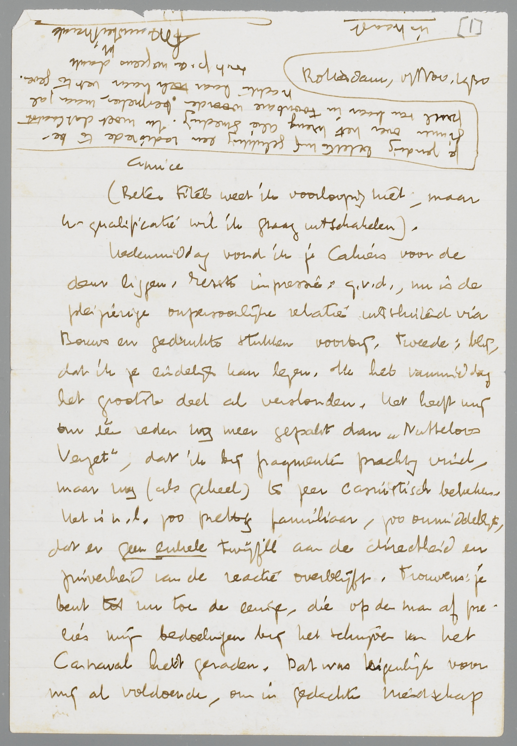Hedenmiddag vond ik je Cahiers voor de deur liggen. Eerste impressie: g.v.d., nu is de pleizierige onpersoonlijke relatie uitsluitend via Bouws en gedrukte stukken voorbij. Tweede: blij, dat ik je eindelijk kan lezen. Ik heb vanmiddag het grootste deel al verslonden. Het heeft mij om één reden nog meer gepakt dan Nutteloos Verzet, dat ik bij fragmenten prachtig vind, maar nog (als geheel) te zeer casuïstisch bekeken. Het is n.l. zoo prettig familiaar, zoo onmiddellijk, dat er geen enkele twijfel aan de directheid en zuiverheid van de reactie overblijft. Trouwens: je bent tot nu toe de eenige, die op den man af precies mijn bedoelingen bij het schrijven van het Carnaval hebt geraden. Dat was eigenlijk voor mij al voldoende, om in gedachte vriendschap te sluiten.