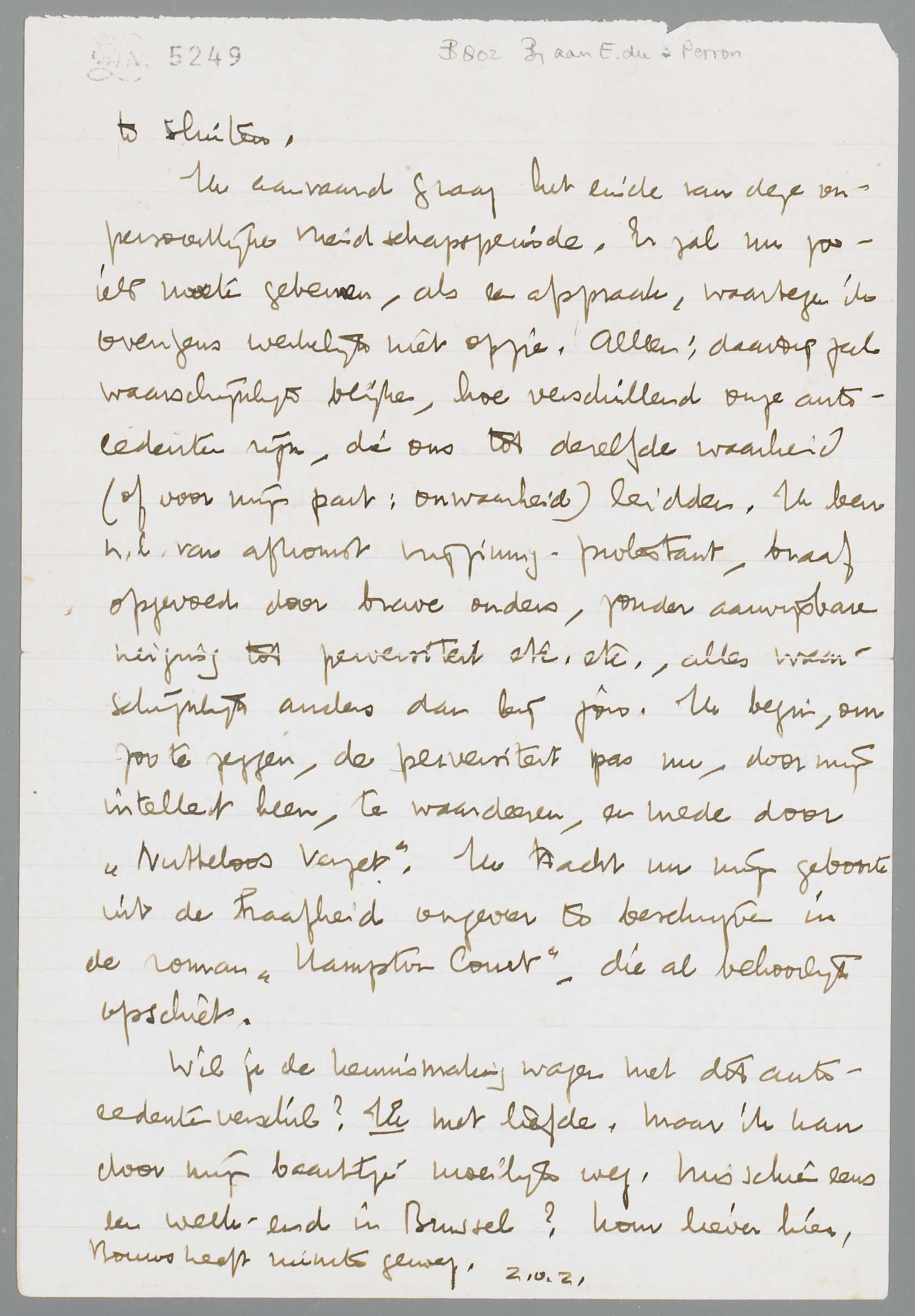 Ik aanvaard graag het einde van deze onpersoonlijke vriendschapsperiode. Er zal nu zooiets moeten gebeuren, als een afspraak, waartegen ik overigens werkelijk niet opzie. Alleen: daarbij zal waarschijnlijk blijken, hoe verschillend onze antecedenten zijn, die ons tot dezelfde waarheid (of voor mijn part: onwaarheid) leidden. Ik ben n.l. van afkomst vrijzinnig-protestant, braaf opgevoed door brave ouders, zonder aanwijsbare neiging tot perversiteit etc. etc., alles waarschijnlijk anders dan bij jou. Ik begin, om zoo te zeggen, de perversiteit pas nu, door mijn intellect heen, te waardeeren, en mede door Nutteloos Verzet. Ik tracht nu mijn geboorte uit de braafheid ongeveer te beschrijven in de roman Hampton Court, die al behoorlijk opschiet.