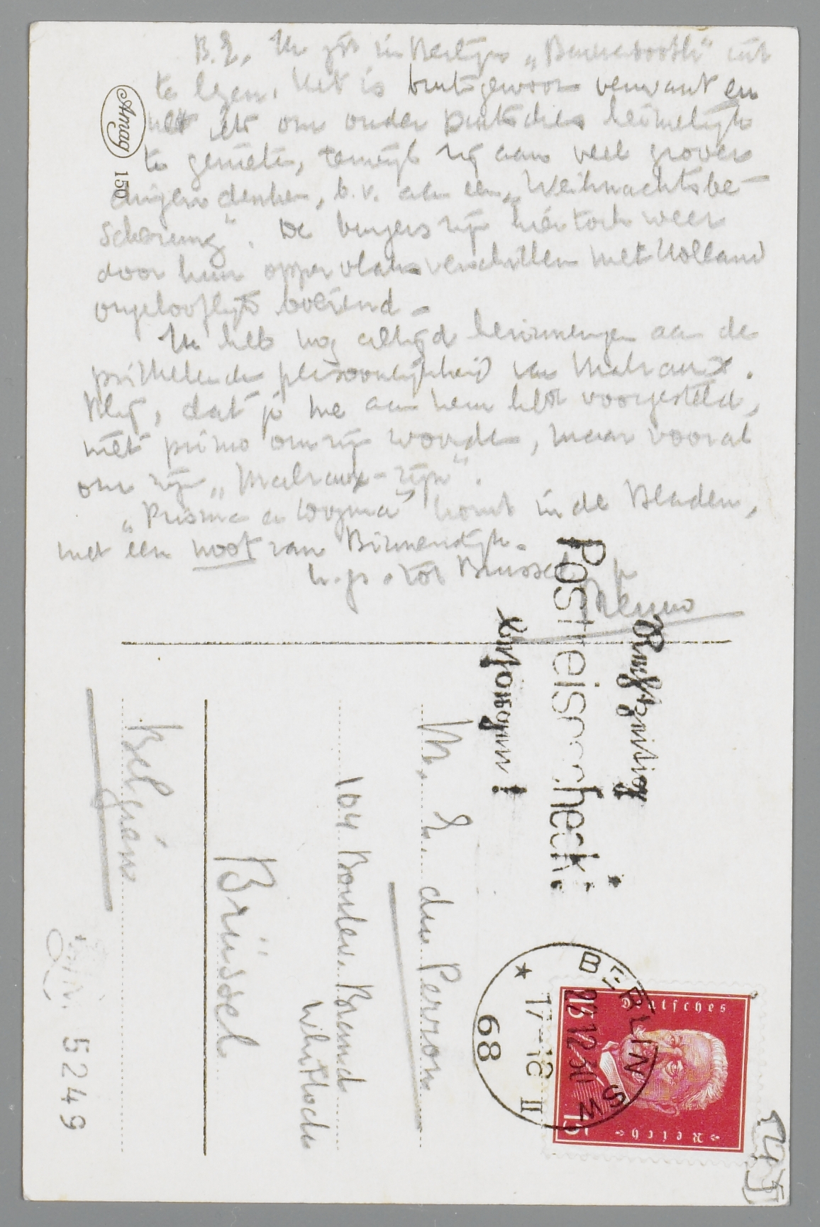 Ik zit in Berlijn Barnabooth uit te lezen. Het is buitengewoon verwant en net iets om onder Duitschers heimelijk te genieten, terwijl zij aan veel grover dingen denken, b.v. aan een ‘Weihnachtsbescherung’. De burgers zijn hier toch weer door hun oppervlaksverschillen met Holland ongelooflijk boeiend.